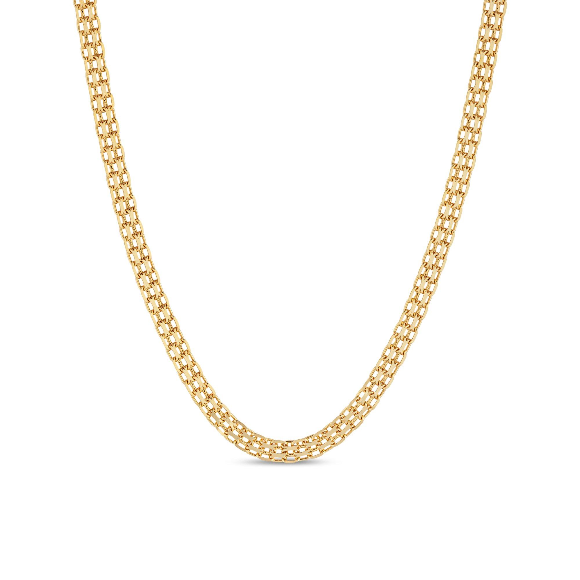 Die Halskette von L'Atelier Gold 18 Karat wird aus drei Reihen Kettengliedern geformt, die flach am Hals aufliegen. Damit erinnert sie an eine Milaneser Kette, doch ist sie durch die filigranen Glieder zarter und raffinierter. Das Collier ist ein wunderschöner Stand-alone von zeitloser Eleganz.