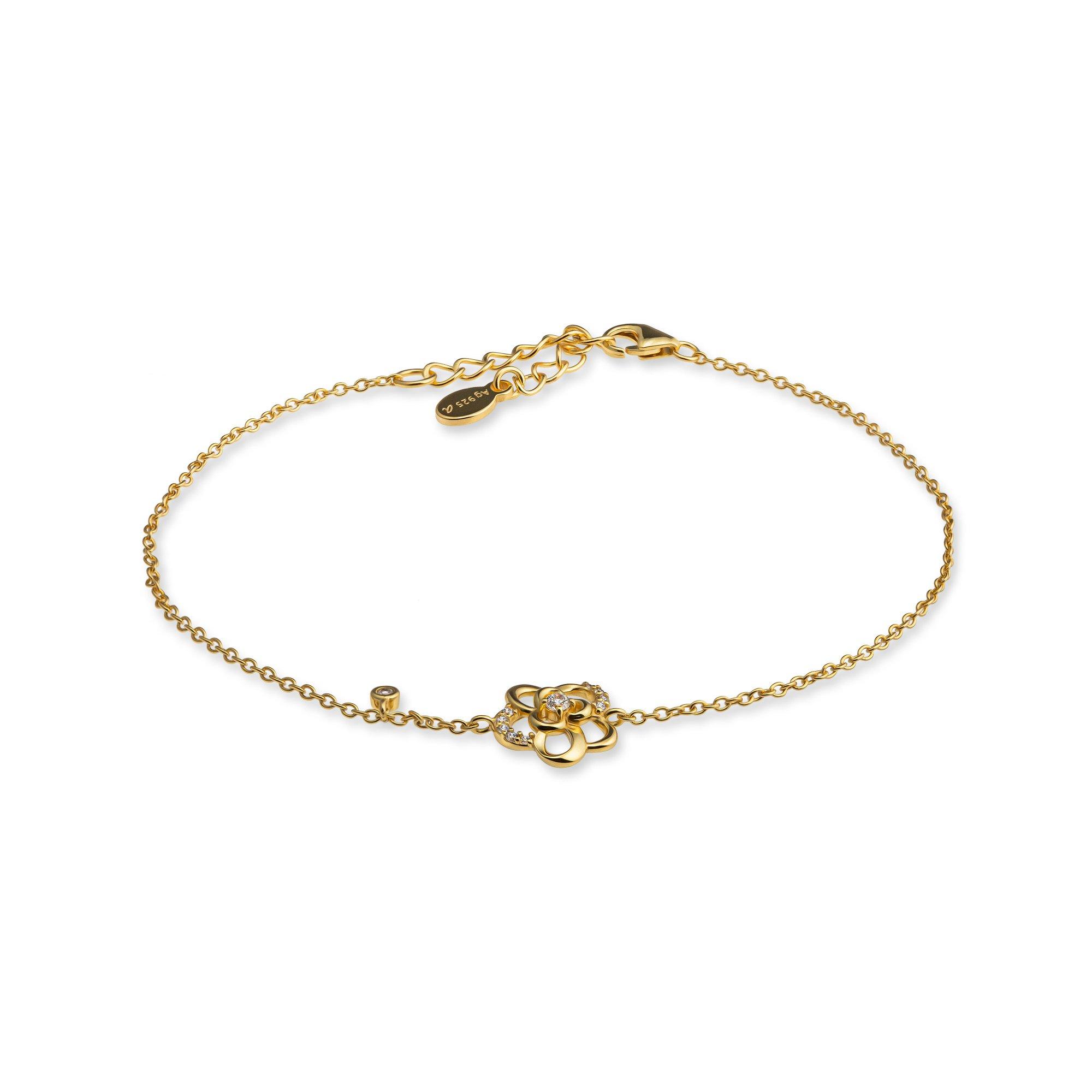 Dieses feine Armbändchen von L'Atelier Sterling Silver 925 ist vergoldet. Das filigrane Design mit der stilisierten Blütenform und den winzigen Ziersteinen erzeugt eine edle nostalgische Note.