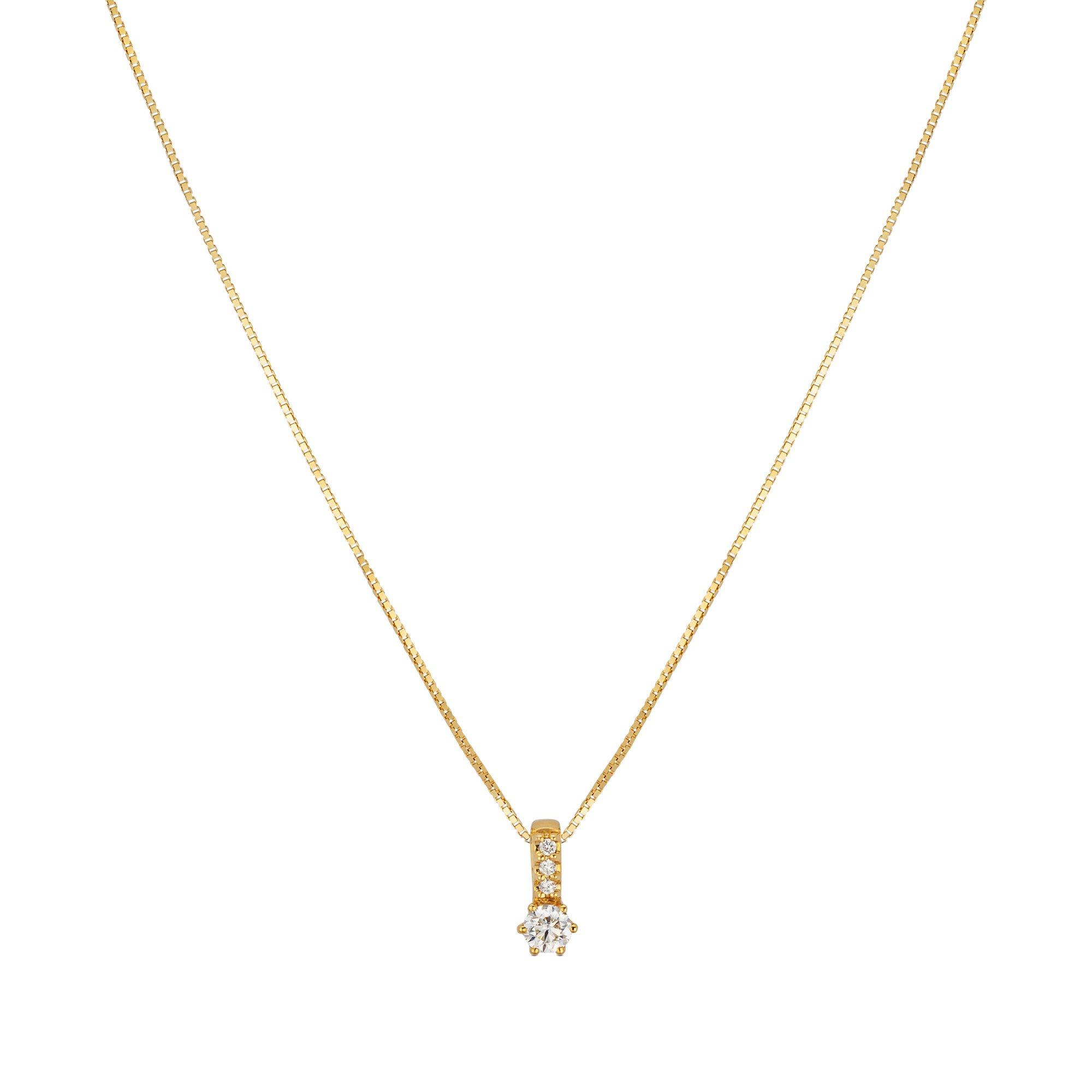 Die Halskette von Sergio Ferris setzt mit dem Anhänger an der venezianischen Kette ein funkelndes Highlight. Die längliche Öse am Anhänger aus Gold ist mit drei Brillanten besetzt und führt zum vierten Diamanten, der in der Chaton-Fassung schön in Szene gesetzt wird.