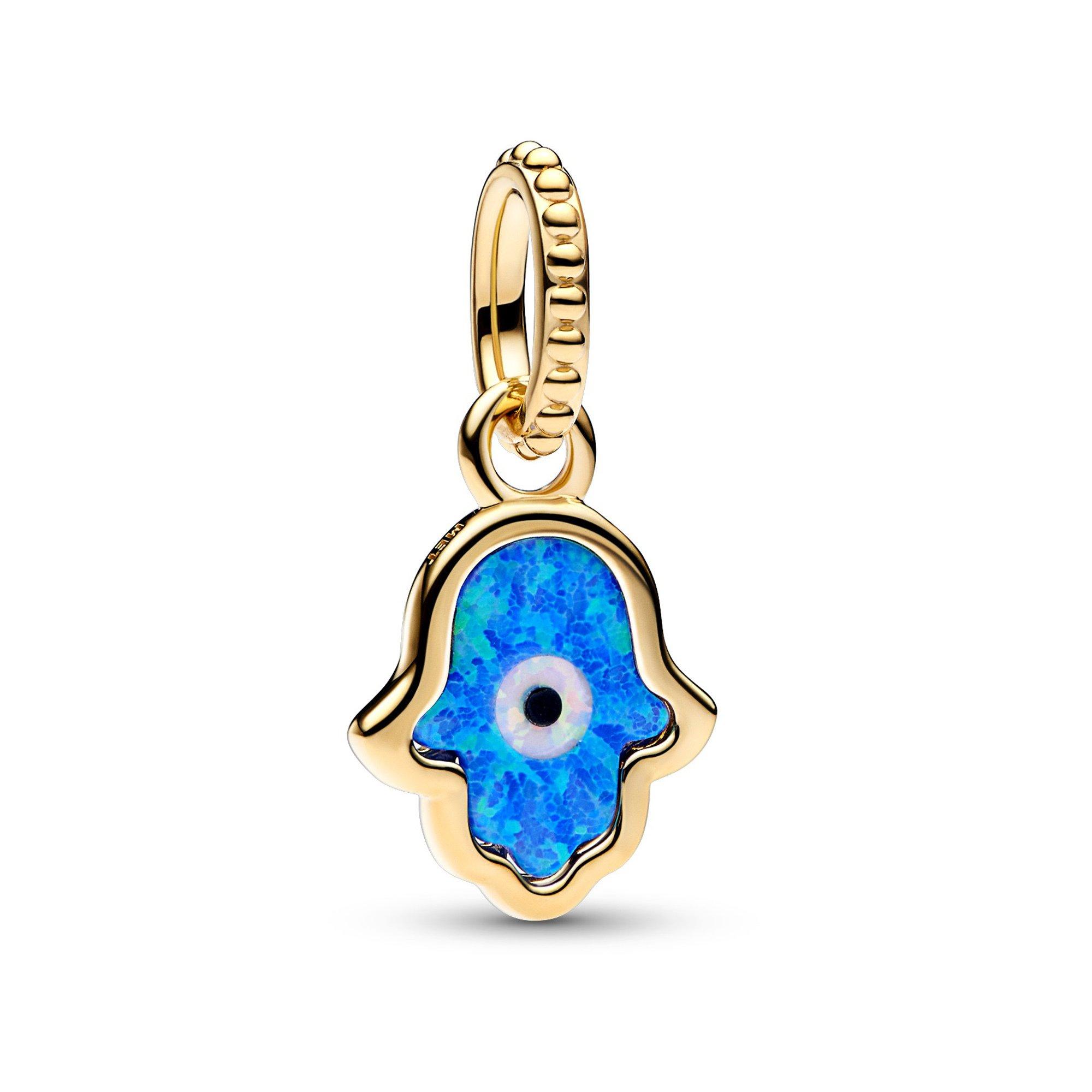 Dieses Hand der Fatima-Charm enthält einen schimmernden, tiefblauen, im Labor hergestellten Opal. Auf der einen Seite befindet sich ein offen gearbeitetes Sonnenstrahlendesign, das vom Auge der Vorsehung mit einem weissen, im Labor hergestellten Opal in der Mitte ausgeht. Die Hand der Fatima wird traditionell als Talisman zum Schutz vor dem Bösen getragen, gilt aber auch als Segen spendende Geste, die Freundschaft und Anmut in dein Leben bringt.