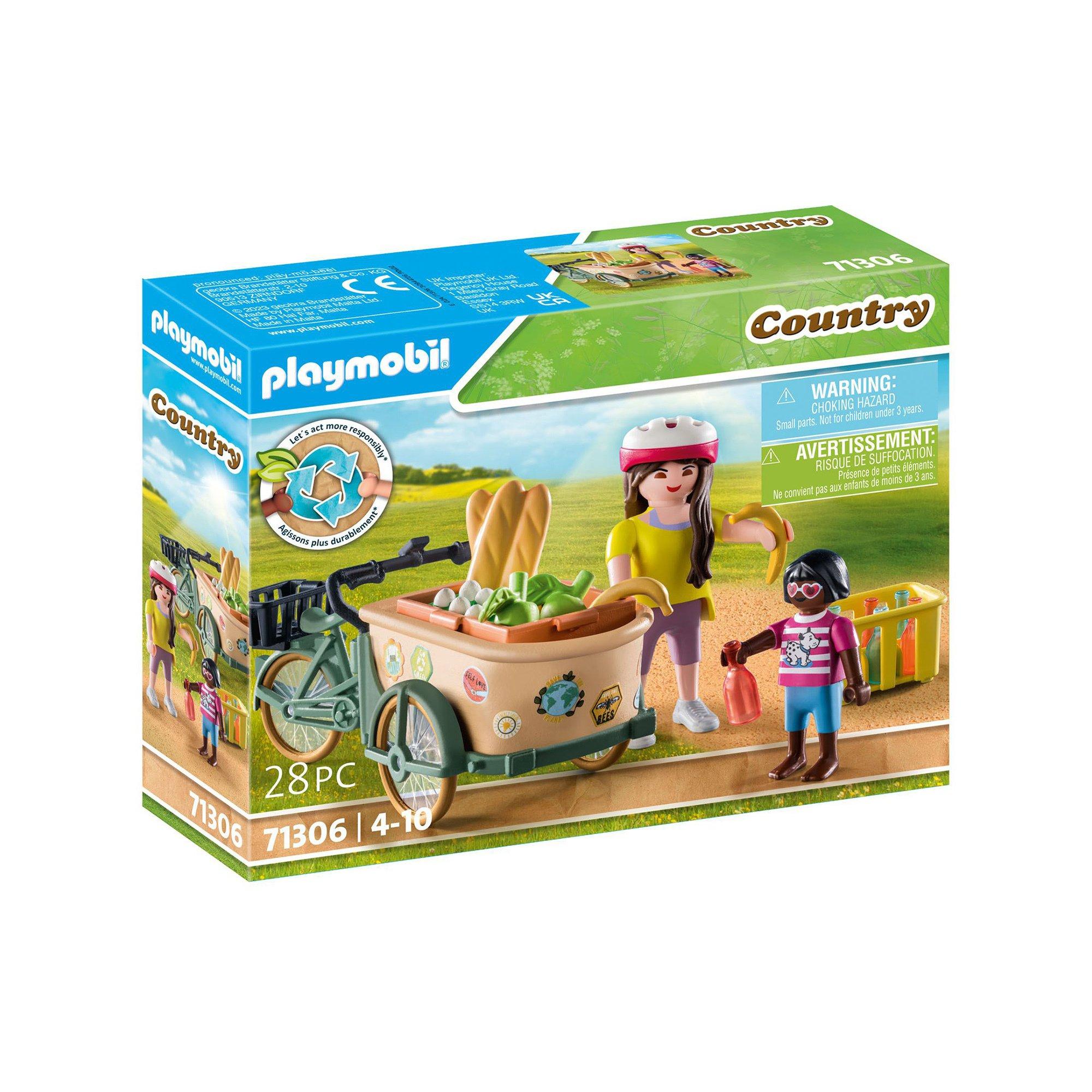 Das 28-teilige Spielfigurenset enthält zwei PLAYMOBIL-Figuren, ein Lastenfahrrad mit austauschbarer Transportschale, eine Gemüsebox, eine Getränkekiste mit Flaschen und weitere Extras.