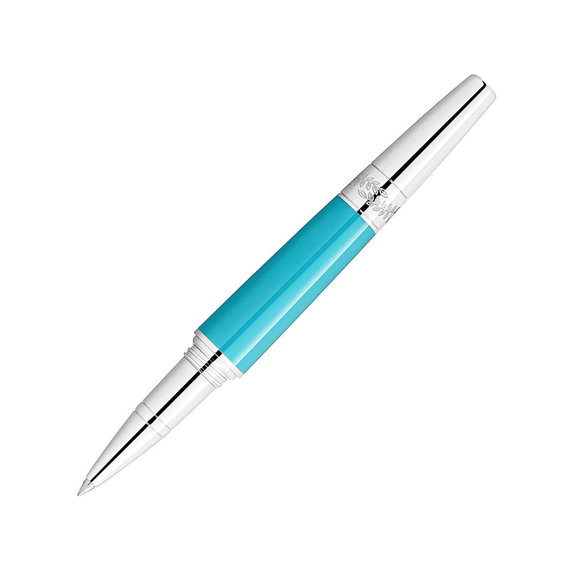 Diese Edition verweist bei Edelharz von Kappe und Korpus auf eine ihrer Lieblingsfarben, Türkis. Gleichzeitig erinnert die schlanke, elegante Silhouette an Maria Callas anmutige Schönheit. Als Verweis auf ihre vom Meer umgebene griechische Heimat wird der platinierte Clip von einem Stein geziert, dessen Farbe an das strahlende Türkisblau der Ägäis erinnert. Ein Kostümdetail einer ihrer unverkennbaren Bel-Canto-Rollen - Bellinis „Norma“ - wird von einem Muster aus Lorbeerblättern aufgegriffen, die den platinierten Konus der Edition ebenso umgeben wie die geprägte Signatur der berühmten Sopranistin.