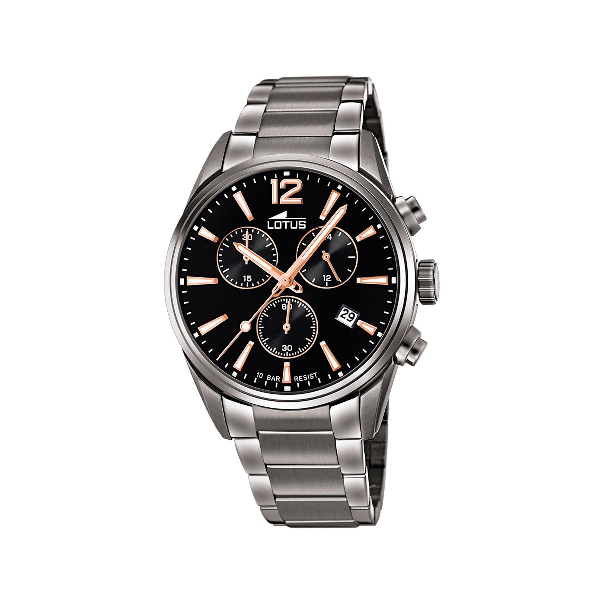 Lotus Herrenuhr mit einem Edelstahlgehäuse, einem Mineralglas und einem Edelstahlband.
