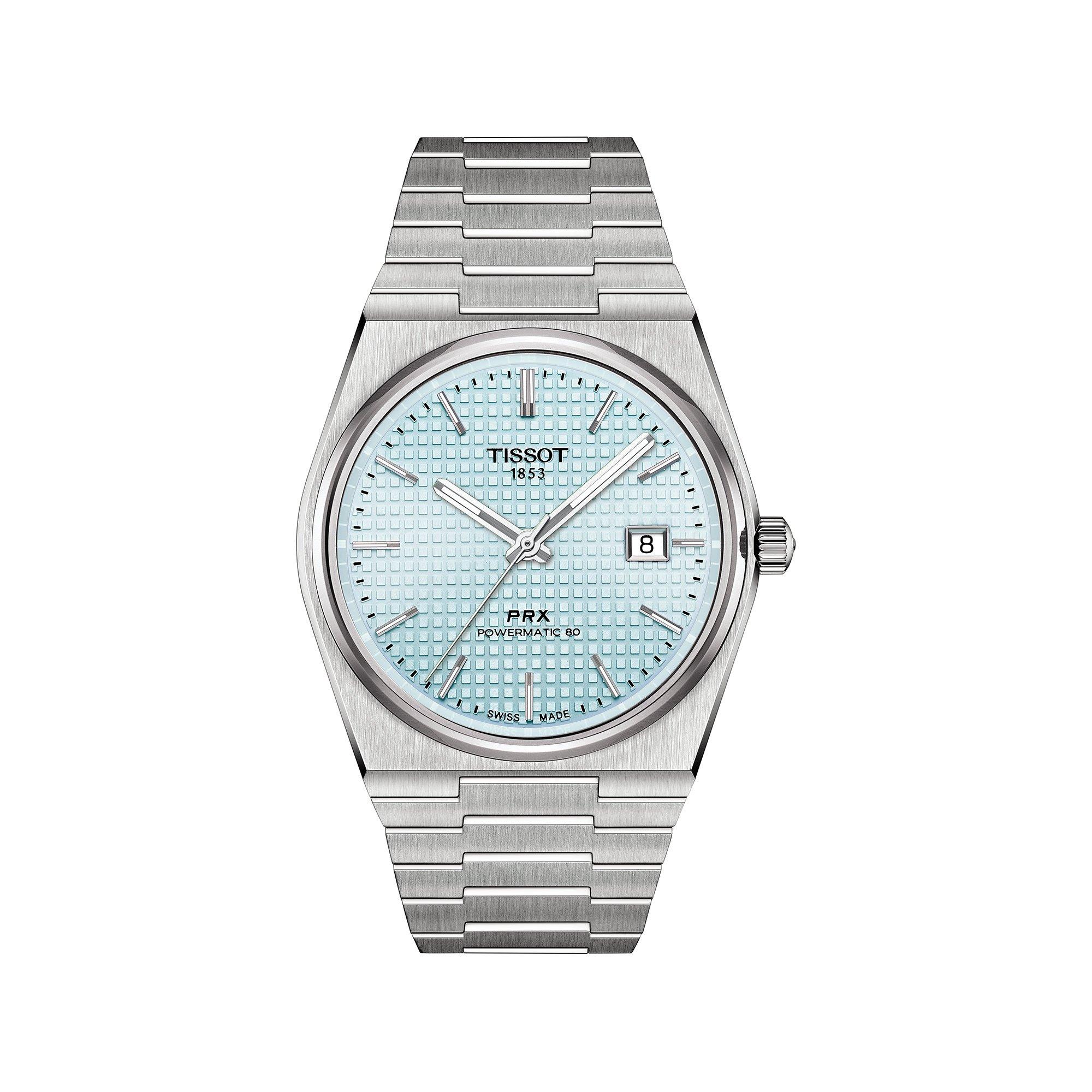 Diese Ausführung der Tissot PRX Powermatic 80 besitzt ein hellblaues Zifferblatt mit Indizes und ein 316L-Edelstahlarmband mit Schnellwechselsystem und Butterfly-Faltschliesse mit Drückern.