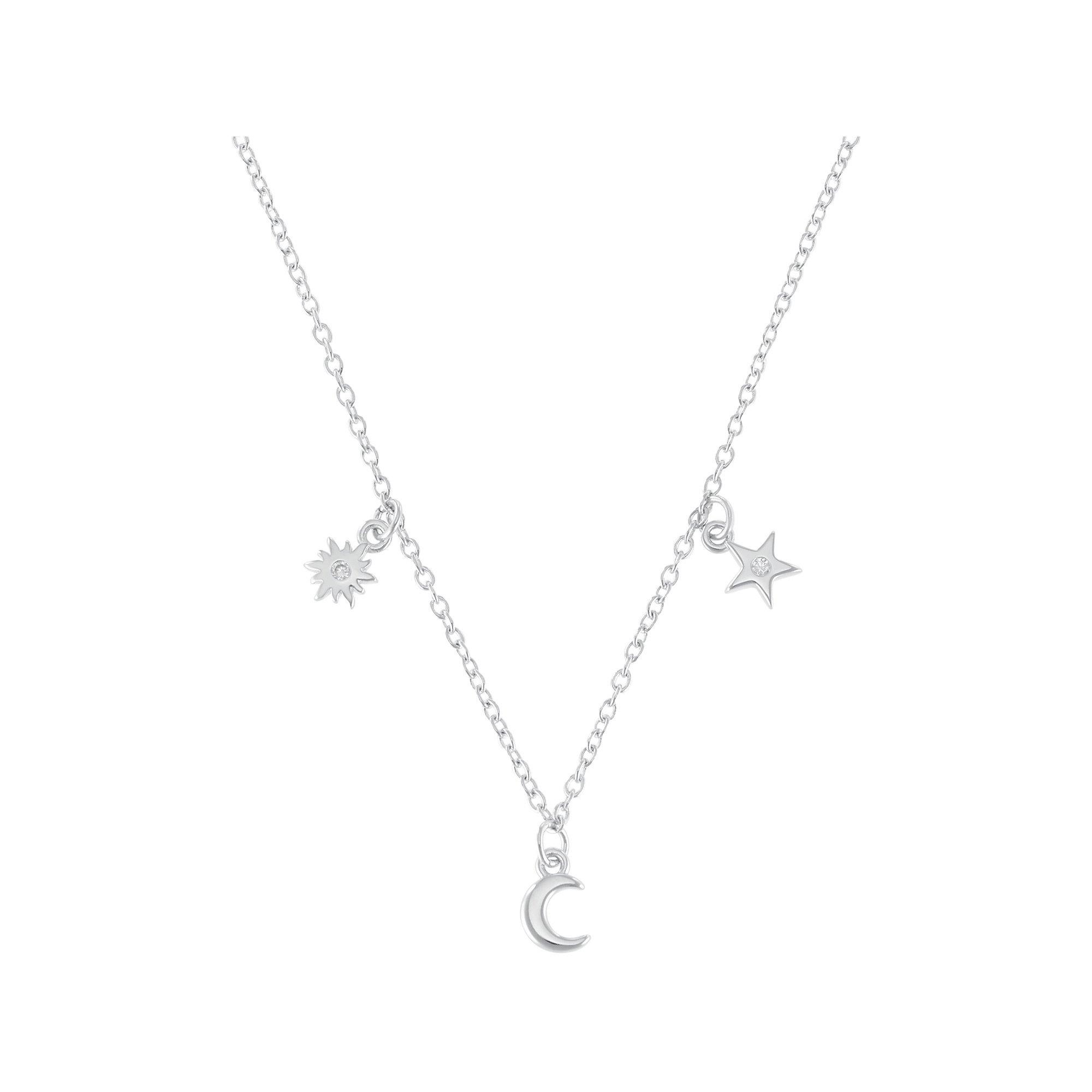 Sonne, Mond und Sterne: Kinder Mädchen Halskette von s.Oliver. Die Kette für Mädchen besteht aus hochwertigem 925 Sterling Silber und funkelnde Zirkonia (synth.) Steine verzieren den Halsschmuck obendrein. Drei aussagekräftige Anhänger gefallen besonders an dem Collier für Girls. Das Trio aus Sonne, Mond und Stern symbolisiert Lebensfreude und Glück oder auch einen Neubeginn. Die längenverstellbare Mädchenkette (37+3 cm) schliesst mit einem gut handlichen Karabiner.