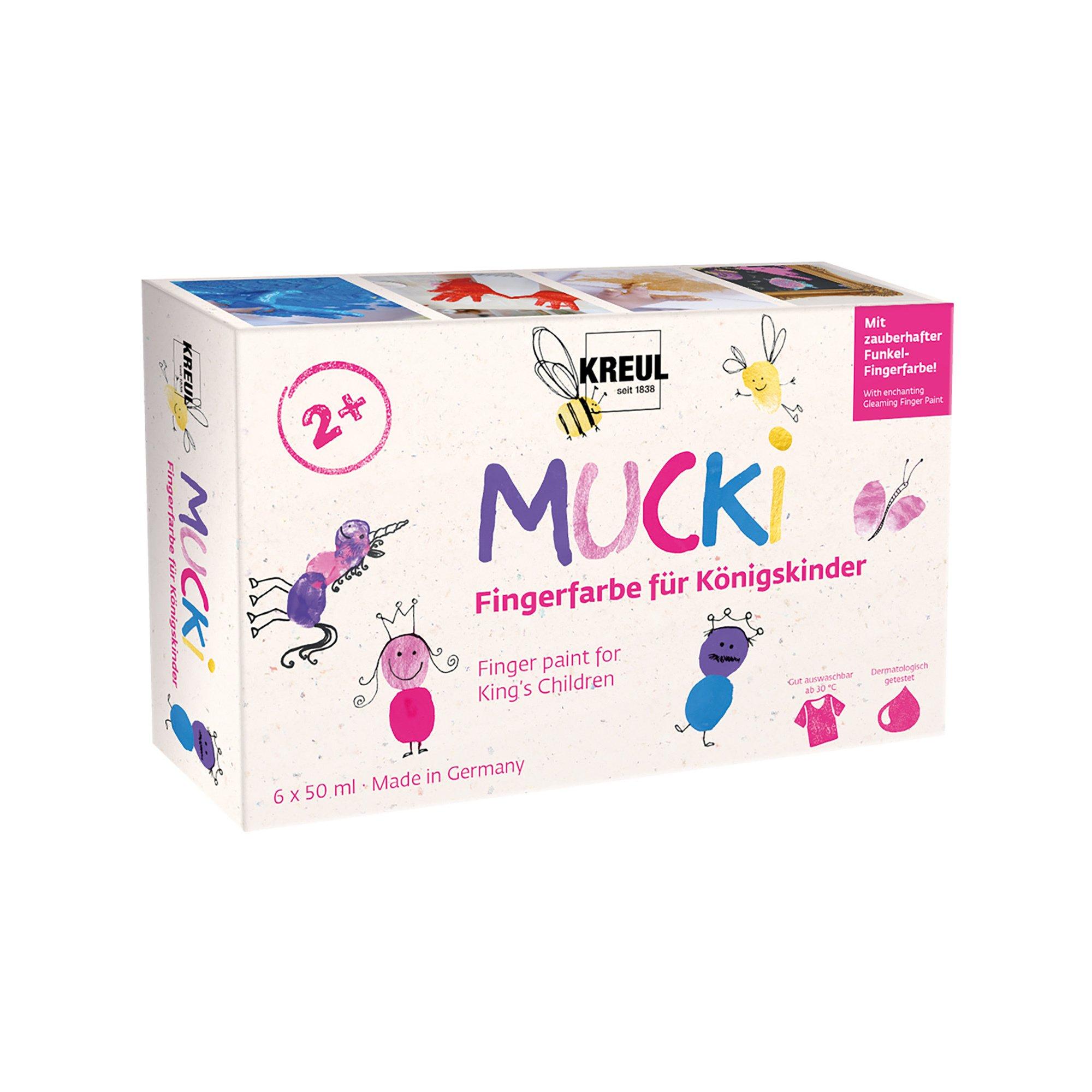 Einmal so furchtlos wie ein Ritter oder so anmutig wie eine Prinzessin sein: Wenn funkelnder Goldschatz und magisches, metallisch-schimmerndes Feenstaub-Rosa auf leuchtendes Pink und Blau treffen, fangen Augen zu glitzern an. Aus weissem Papier entsteht ein farbstarker Schatz und kleine Rabauken werden zu sanften Königskindern. Die Farbtöne bezaubern und bringen Kind und Eltern zum Strahlen. Das Mini-Set ist eine liebevolle Geschenkidee zum Mitbringen. Kleine Künstler ab 2 Jahren können damit MUCKI Fingerfarben kennenlernen und probieren.