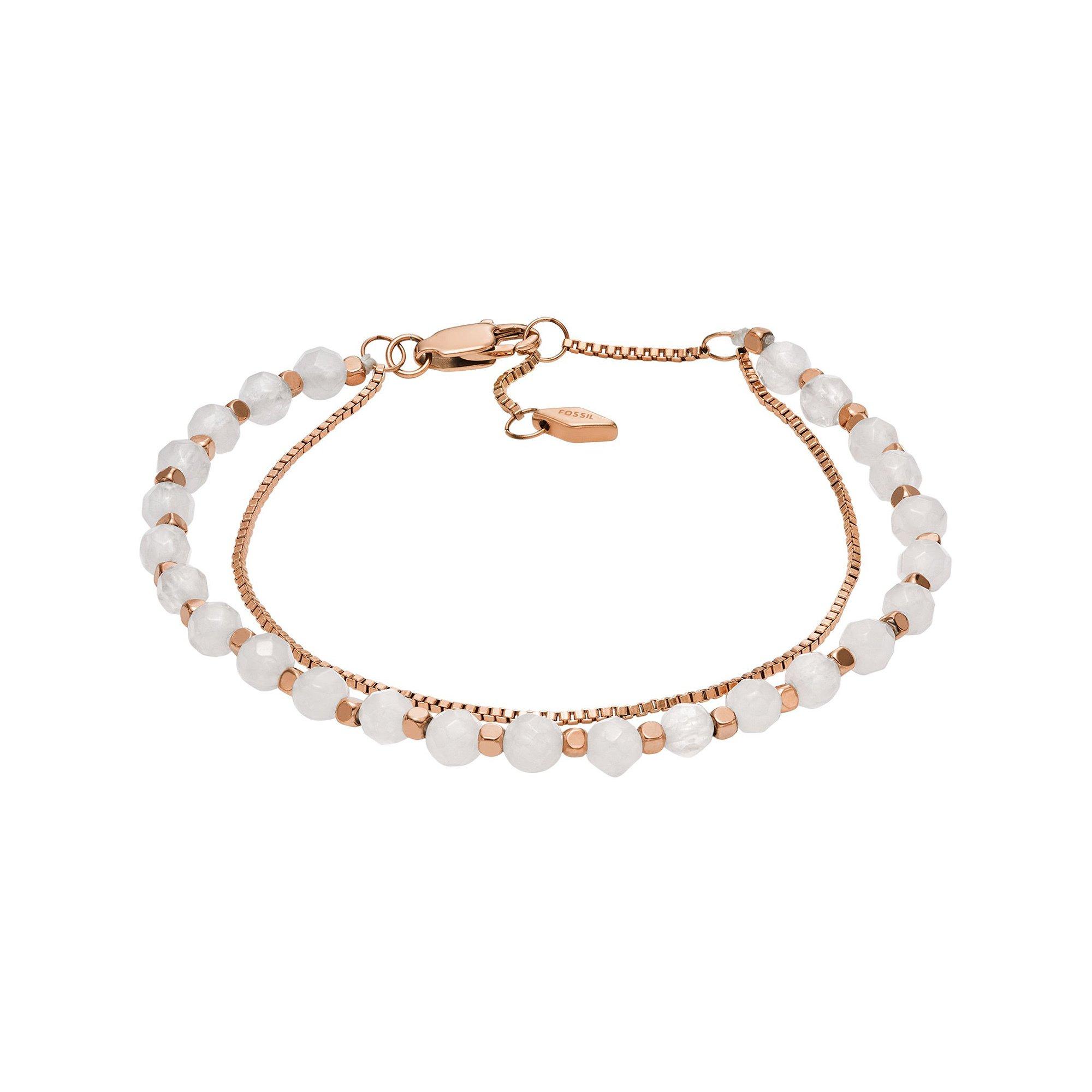 Stylish. Spannend. Stackbar. Dieses wunderschöne Armband aus poliertem, roségoldfarbenem Edelstahl hat echte Rosenquarz-Beads und einen Karabinerverschluss.