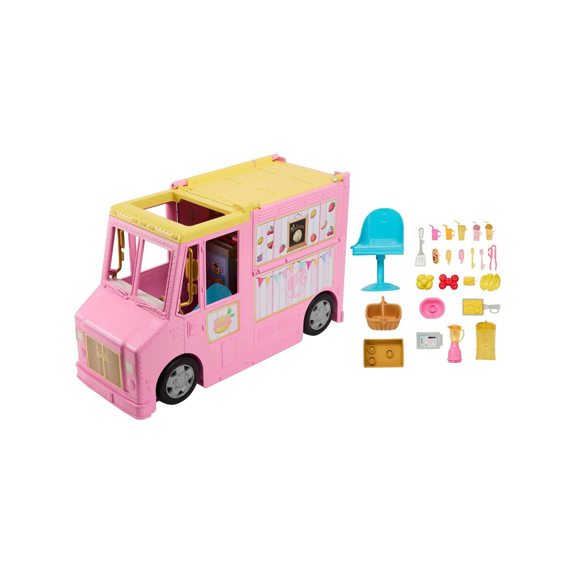 Hup, hup! Barbies Limonadenmobil ist mit süssen Details ausgestattet und bietet alles, was für die Zubereitung fruchtiger eisgekühlter Getränke notwendig ist. Es lässt sich auf zweierlei Weise nutzen: Wird der Truck geöffnet, so kann Barbie im Zubereitungsbereich arbeiten, wird er geschlossen, geht es an einem heissen Sommertag auf Spritztour. Die Seite des Trucks kann mit Kasse und Stuhl zu einem Essbereich im Freien umgebaut werden. Der perfekte Hintergrund für eine Barbie-Puppe, die ihr eigenes Geschäft eröffnen möchte. Puppe nicht enthalten. Abweichungen in Farbe und Gestaltung vorbehalten.