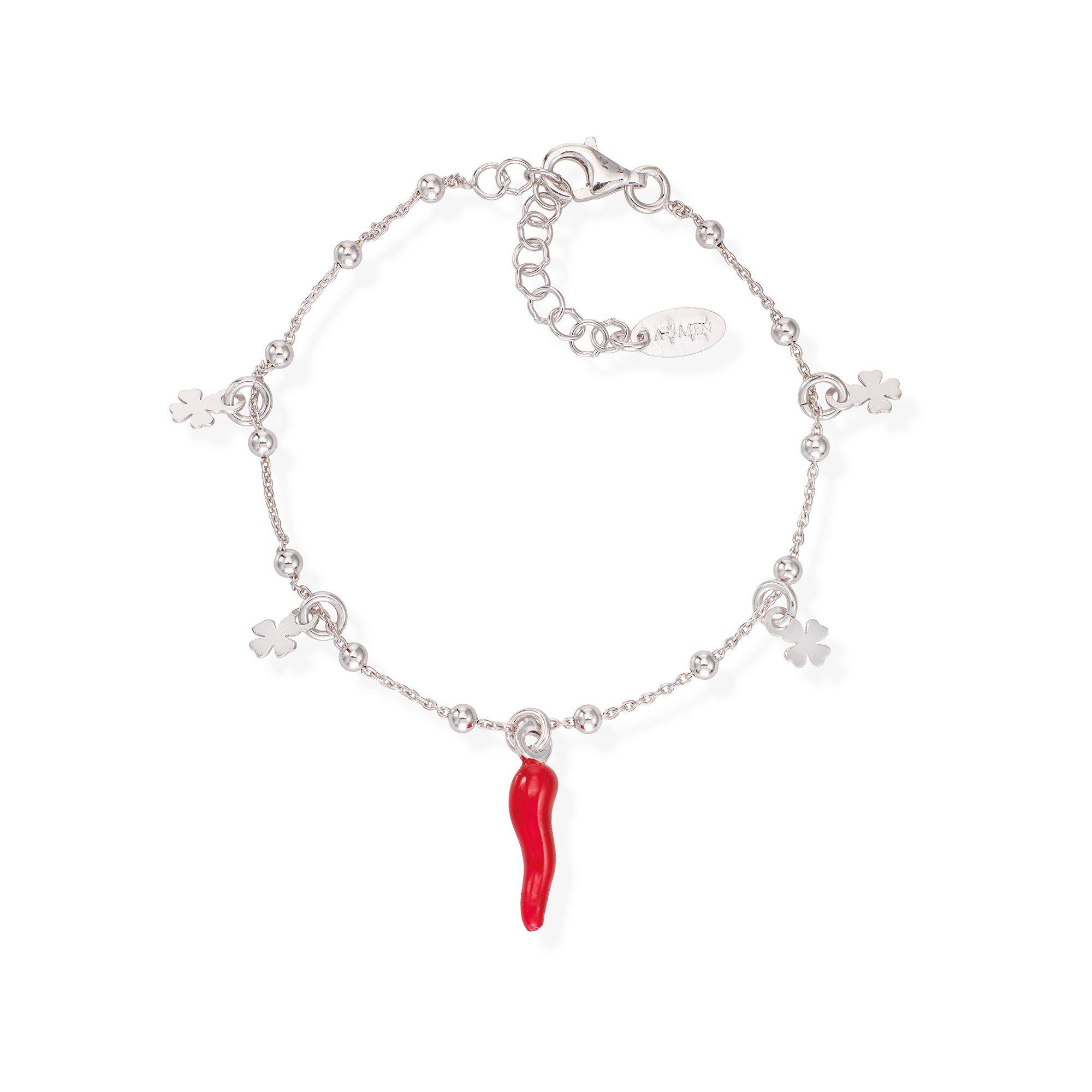 Dieses filigrane Armband von Amen besteht aus Sterlingsilber und präsentiert sich mit Perlen, Kleeblatt-Anhängern und einem Horn-Anhänger in der Mitte. Die Länge des Armbands kann individuell angepasst werden.