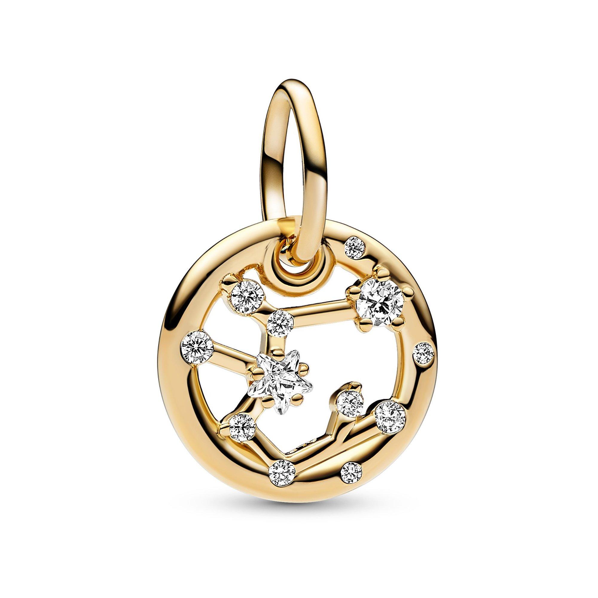 Lass deinen Look von den Sternen leiten mit dem Sternzeichen Schütze Charm-Anhänger. Dieser Pandora Moments Charm-Anhänger ist in unserer vergoldeten Metalllegierung gefertigt, hat einen kreisförmigen Aussenrahmen und klare, glitzernde Cubic Zirkonia sowie die Form des Sternzeichens Schütze. Auf der Rückseite des Rahmens ist „Sagittarius“ eingraviert. Der Schütze ist witzig, ehrlich und direkt und wie der Schütze in deinem Leben intellektuell veranlagt, abenteuerlustig und flexibel. Trage ihn als Zeichen der Stärke deines eigenen Sternzeichens oder schenke ihn einem Schützen in deinem Leben als Zeichen der Wertschätzung.