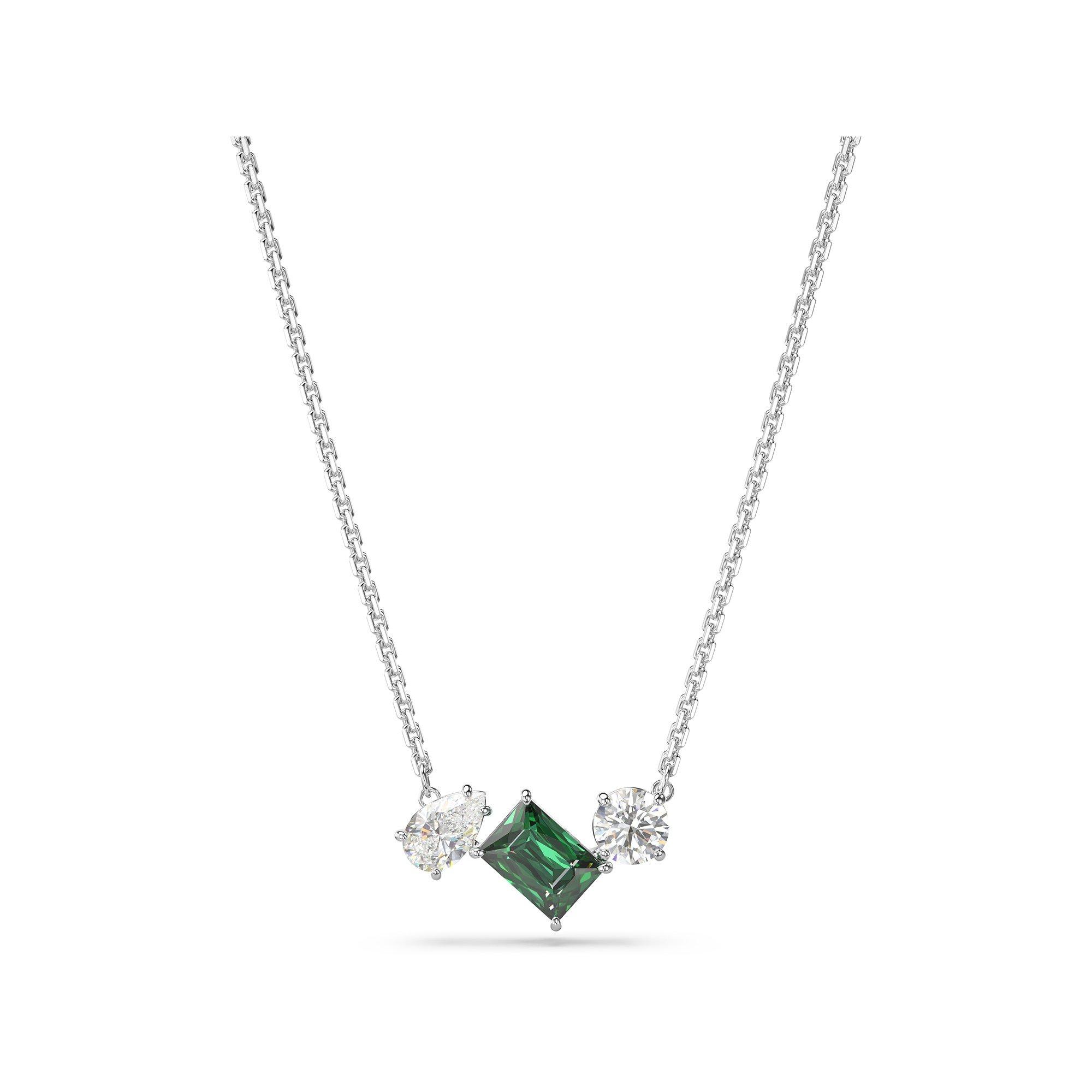 Dieser elegante Mesmera Anhänger zeichnet sich durch exquisite Raffinesse aus – dank seiner gewagten Mischung aus Schliffen und Farben. Das rhodinierte Design wird an einer zarten Kette getragen und besticht mit einem Trio aus Swarovski Zirkonia in Krallenfassung. Neben den unterschiedlichen Formen sticht auch ein strahlendes Mittelelement in hypnotischem Grün hervor. Ein wundervolles Geschenk, um jeden Look zu unterstreichen.