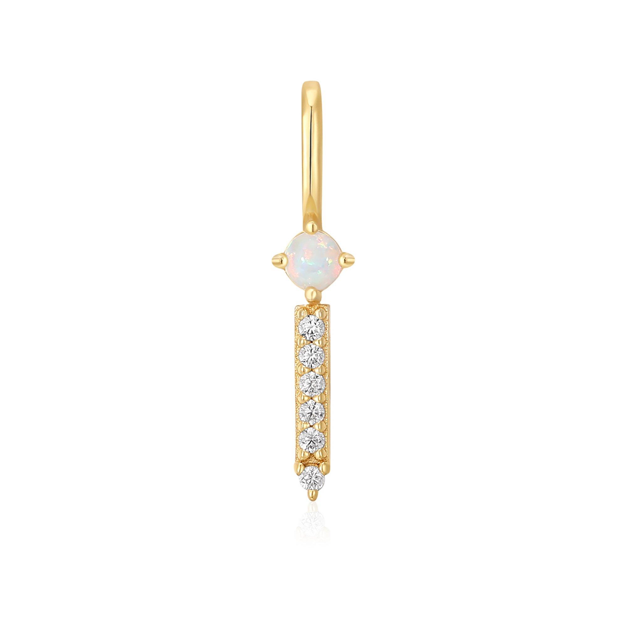 Dieser elegante Charm, der ein perfektes Gleichgewicht zwischen Schillern und Funkeln darstellt, verleiht diesen Halsketten und Armbändern etwas Besonderes. Auf 14kt vergoldetem 925er Sterlingsilber ist ein runder Kyoto-Opal-Edelstein mit einer Reihe funkelnder Zirkonia-Steine gepaart, um einen einzigartigen Tropfen-Charm zu kreieren.