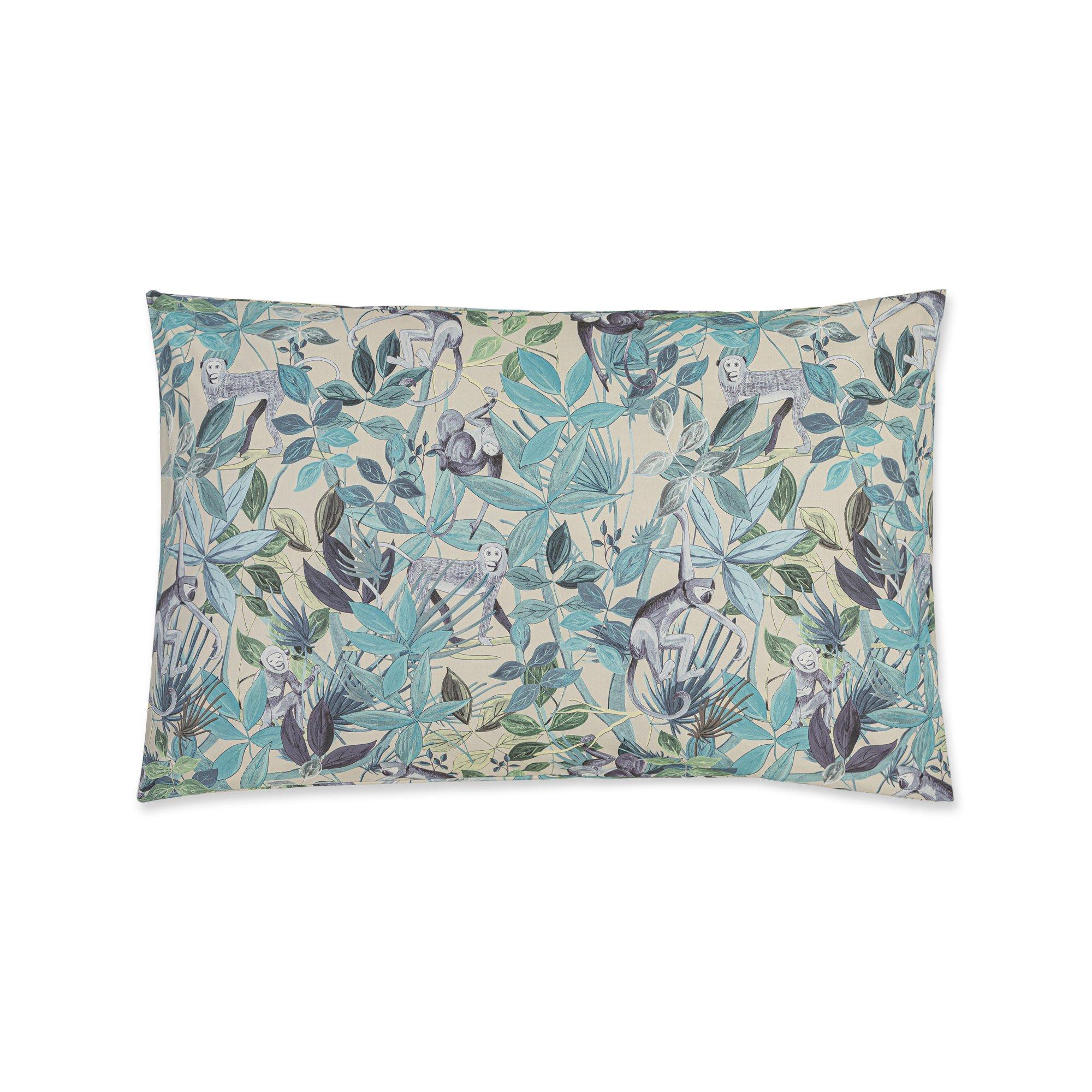 Der Bassetti Gibilterra Kissenbezug zeigt exotische Zeichnungen, die einen abenteuerlichen Dschungel darstellen. Zwischen dem Laub ist ein kleiner wilder Affe zu sehen, der frei zwischen dem Grün der Natur und der Klippe über dem Meer lebt.