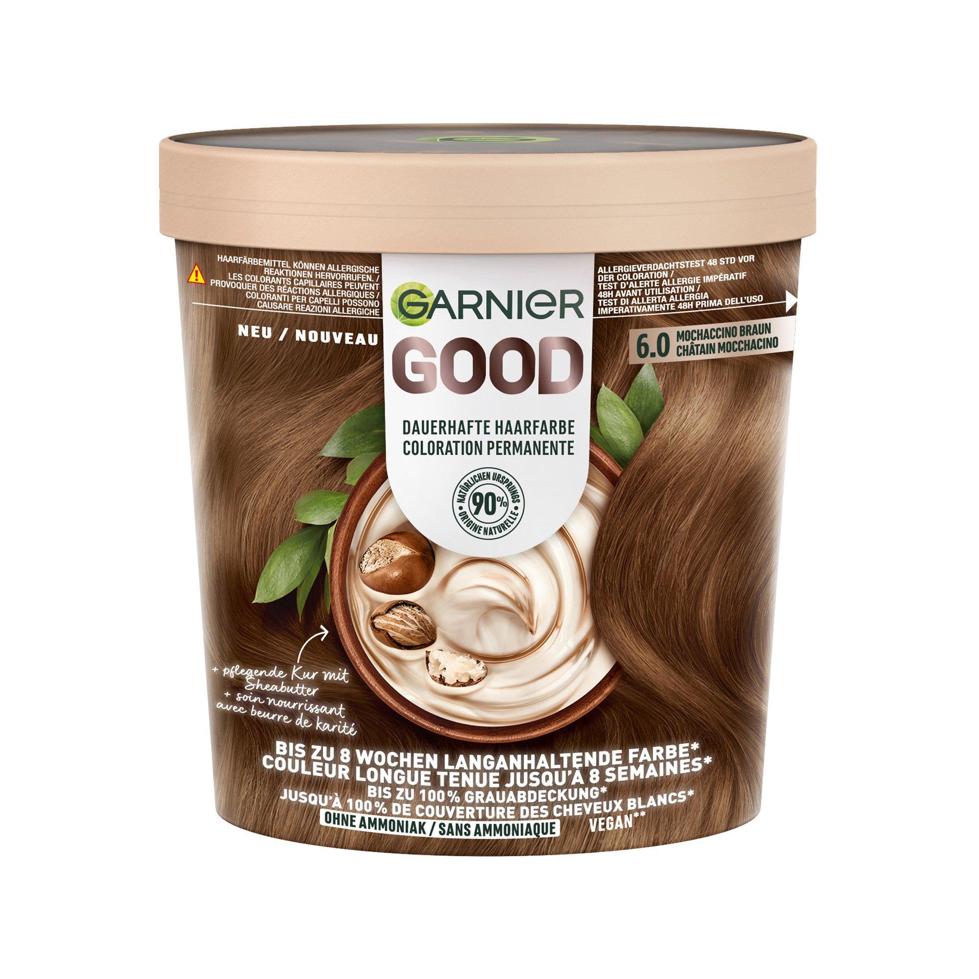 Die dauerhafte Haarfarbe von Garnier GOOD bietet bis zu 8 Wochen langanhaltende Farbe voller Glanz und deckt graue Haare bis zu 100% ab. Die Coloration lässt sich besonders einfach mit den Händen auftragen und duftet angenehm nach Gojibeeren, Orchideen und Sandelholz. Die vegane Formel besteht aus 90% Inhaltsstoffen natürlichen Ursprungs, welche für schöne Effekte und Farbschattierungen sorgt. Gleichzeitig dringen die Farbpigmente tief in die Haarfaser ein und sorgen für ein natürlich aussehendes Farbergebnis.
