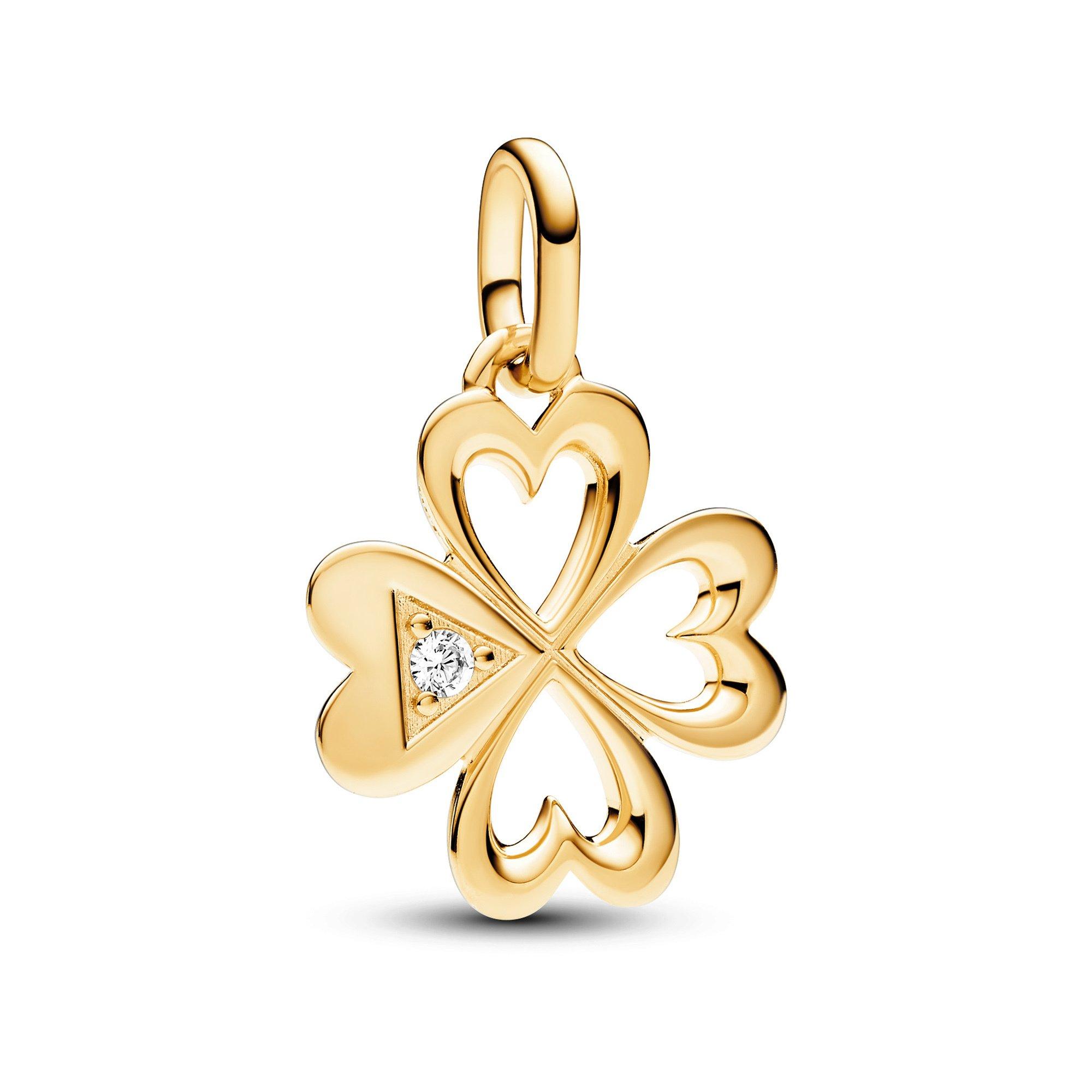 Hol dir das Glück mit dem Pandora ME Herz Vierblättriges Kleeblatt Medaillon-Charm. Mit vier herzförmigen Blättern hat dieses vergoldete Kleeblatt-Medaillon zwei deutlich unterschiedliche Seiten. Eine Seite ist poliert und hat drei ausgestanzte Herzen und ein massives Herz, das mit einem funkelnden Stein in einem Dreiecksdetail besetzt ist. Die andere Seite ist auf allen vier Blättern mit einem Mikroperlenmuster bedeckt. Dieses Kleeblatt-Medaillon-Charm verleiht deinem Look einen goldenen Glanz und erinnert dich daran, dass du selbst deines Glückes Schmied bist. Passend für Pandora ME und Pandora Moments.