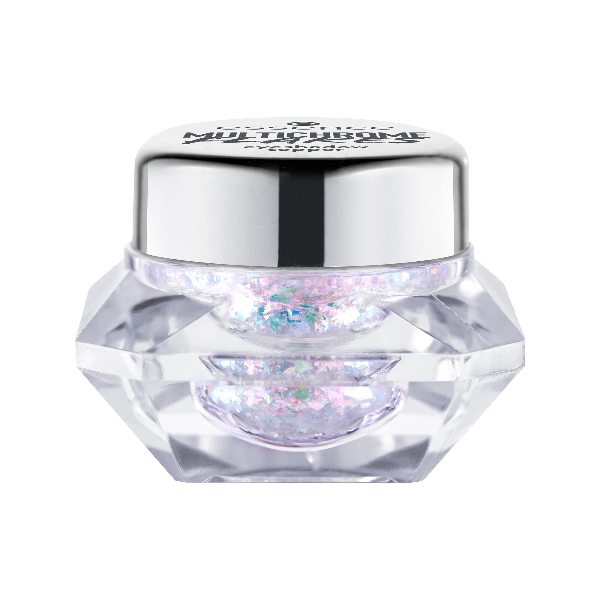 Die leichte, wasserbasierte Textur mit multichromatischen Partikeln des essence MULTICHROME FLAKES eyeshadow topper sorgt für ein Augen-Make-up mit Wow-Effekt. Der Allrounder kann entweder als Lidschatten oder Topper verwendet werden und verleiht jedem Look ultra-shiny Highlights. Die Eyeshadow-Topper ist dabei selbsttrocknend, leicht kühlend und kommt in einem diamentenförmigen Tiegel daher.