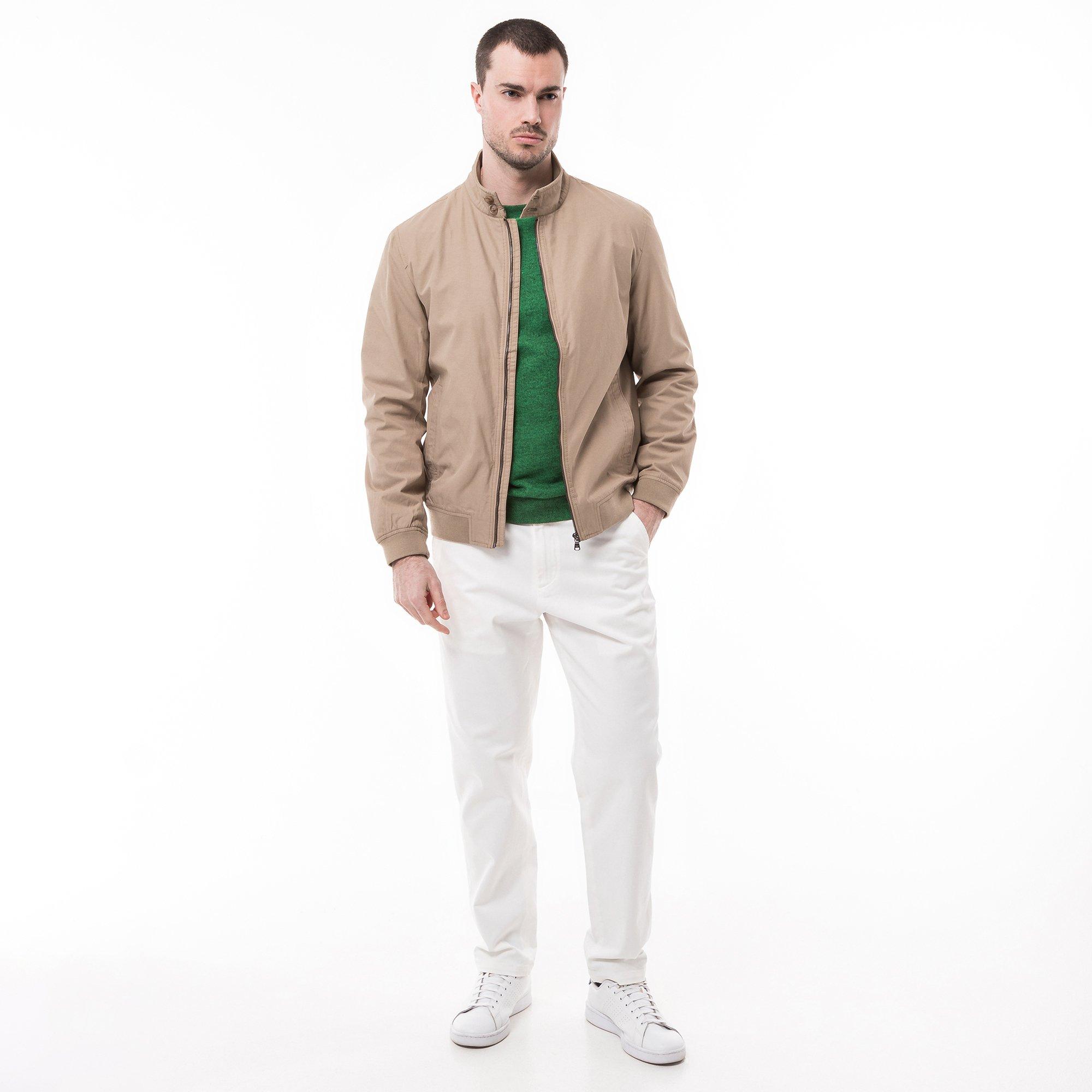 Dieser Blouson bietet eine normale Passform und eleganten Retro-Chic, was ihn zu einer leichten, stilvollen Alltagsjacke macht. Er ist ausgestattet mit einem geknöpften Stehkragen, hat innen zwei Reissverschlusstaschen und eine Tasche, die sich per Klettverschluss schliessen lässt. Zu den gerade geschnittenen Eingriffstaschen reihen sich der charakteristische Rippstricksaum und die Ärmelbündchen als klassische Stilelemente.