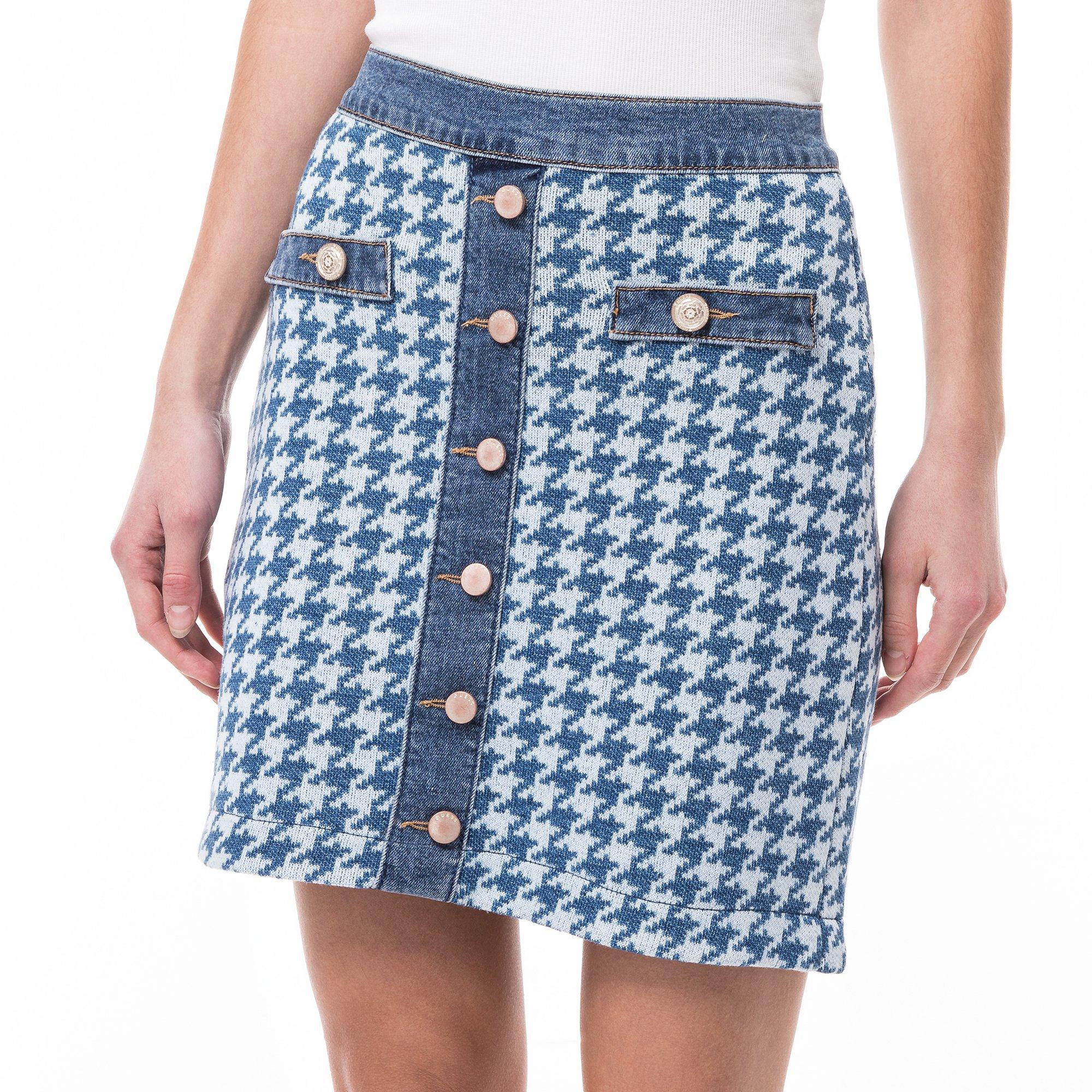 Dieser Mini-Rock von Guess ist mit Reborn Denim hergestellt. Der ultra-softe Jeans-Stoff wird aus Recycling-Baumwollfasern produziert. Die klassischen Retro-Elemente, das XL-Hahnentritt-Muster und die dekorative Knopfleiste und Taschen auf der Vorderseite, prägen den Stil des bequemen Rocks.