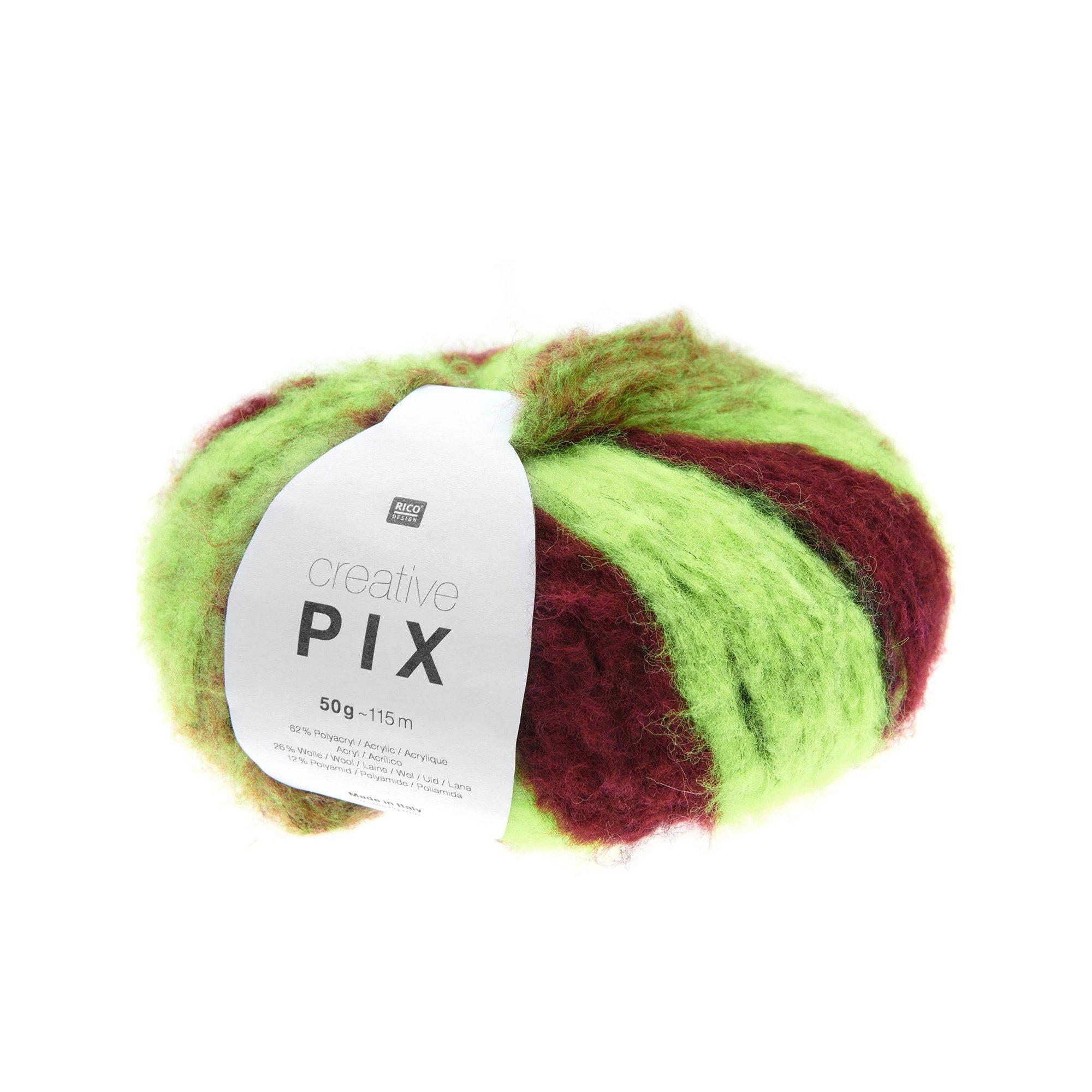 Creativ Pix ist ein superweiches und sehr leichtes Garn mit einem fluffigen Faden. Aus der besonderen Fadenstruktur entstehen dicke und ebenmäßig flauschige Strickstücke. Im unregelmäßigen Print des Garns gibt es harte Farbwechsel und Neon-Akzenten. Die Farbkombinationen sind auffallend und cool.