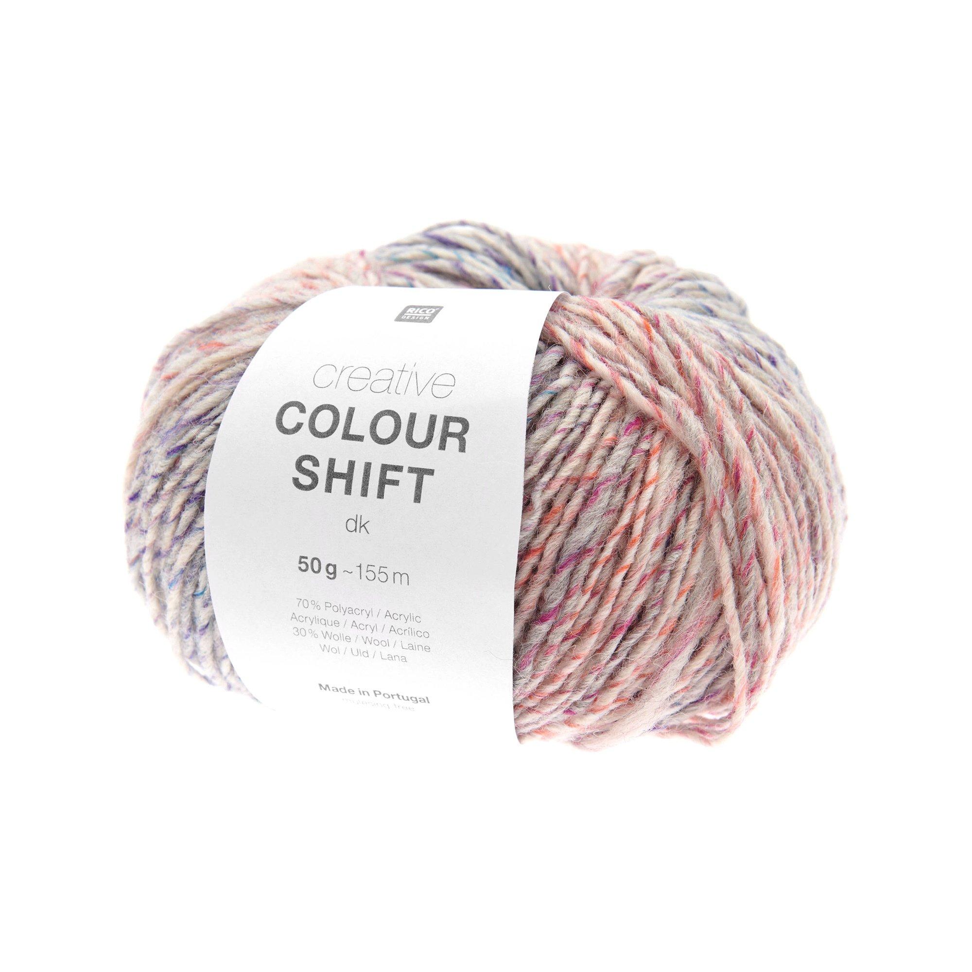 In Creative Colour Shift sind 2 Fäden mit unterschiedlichen Farbverläufen ineinander gedreht und geben dem Garn die charakteristische Twist-Optik. Die Strickstücke haben keinen klassischen Streifen-Print, sondern ineinanderlaufende Farbflächen, die sich natürlich je nach Breite des Strickstücks verschieben. Unter den Farben gibt sowohl tonige als auch bunte, sowohl helle als auch dunkle Farben. Der hohe Acryl-Anteil im Garn macht die Strickstücke leicht und geschmeidig.