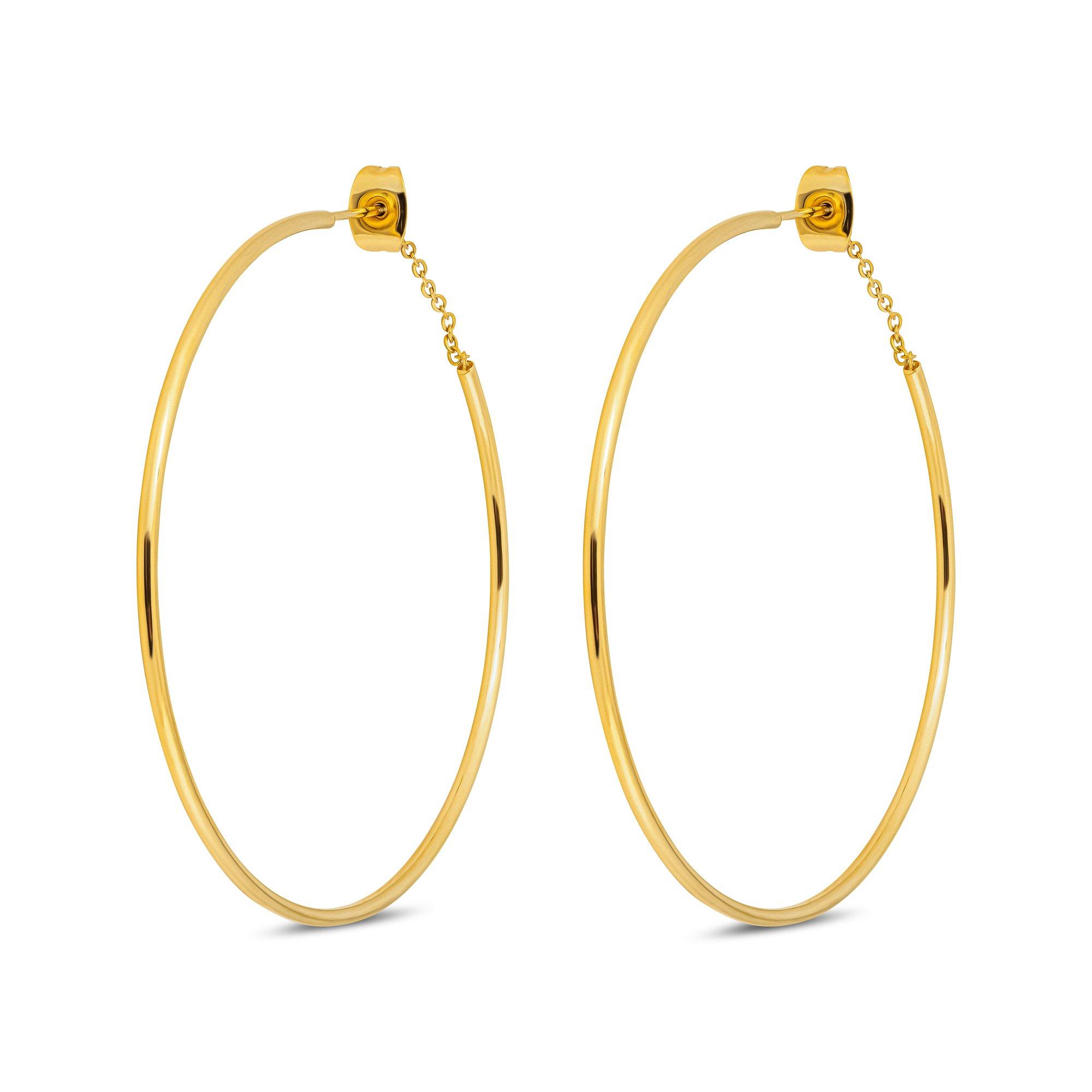 Diese goldfarbenen Creolen aus Edelstahl von Zag Bijoux fallen durch ihr raffiniertes Design auf. Die Rückseite des Steckverschlusses ist an einer filigranen Kette befestigt. Er geht dadurch nicht verloren. Durch das Kettchen ist der Hoop beweglicher.