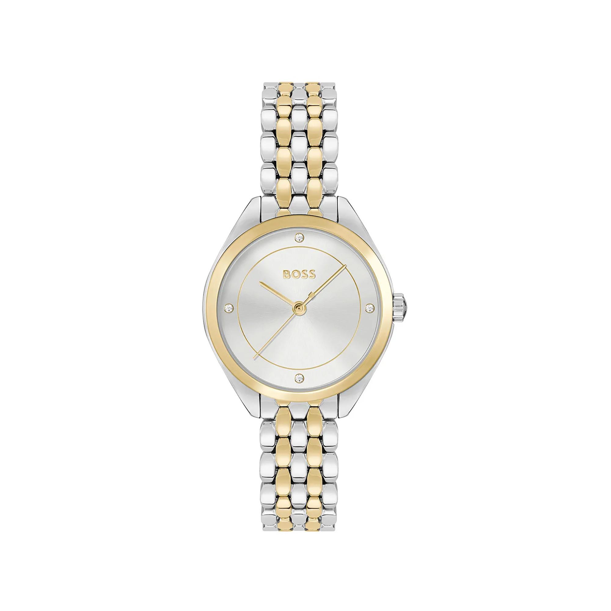 Dieses Modell verfügt über ein silbernes Zifferblatt mit vier kristallbesetzten Indizes. Die Stunden-, Minuten- und Sekundenzeiger sind aus Gold und ergänzen das Design. Das Gehäuse und das Armband dieses Modells bestehen beide aus Edelstahl. Das Armband ist zweifarbig und verfügt über goldionenplattierte Mittelglieder.