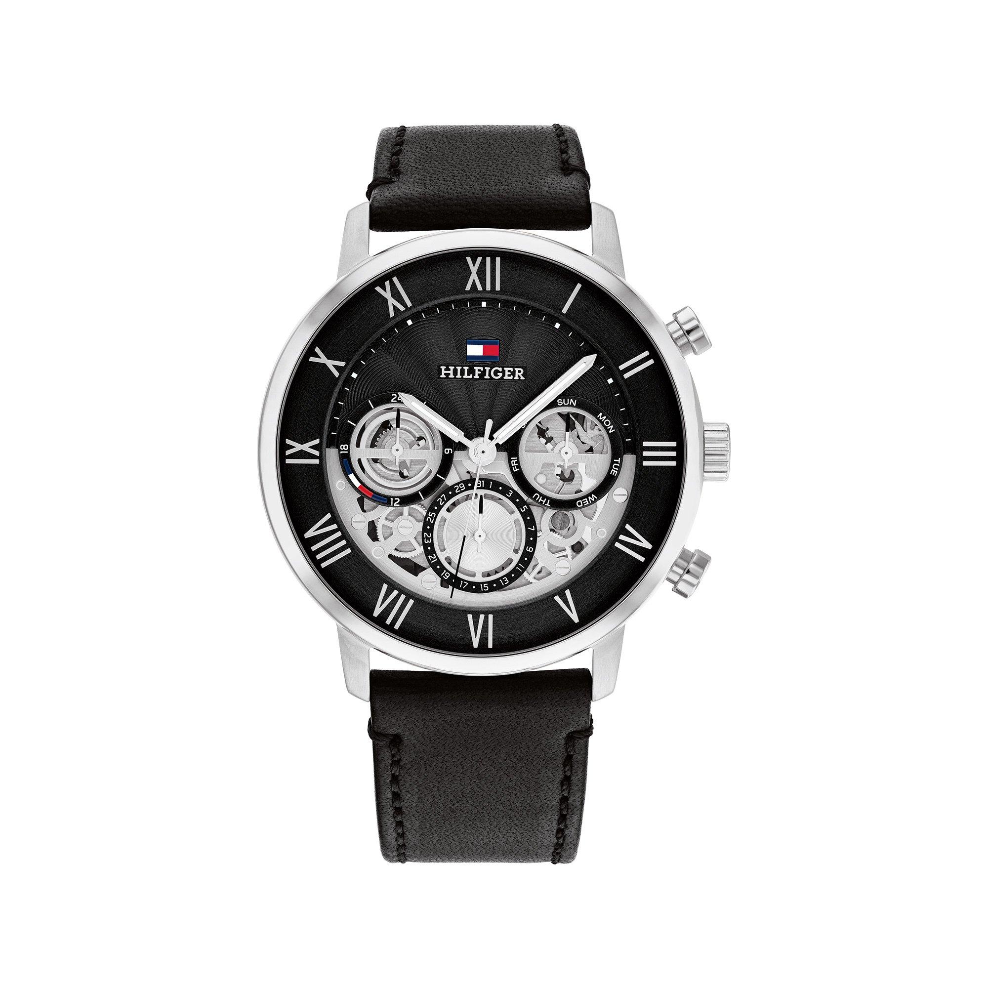 Diese Tommy Hilfiger Uhr hat ein Edelstahl Gehäuse mit einem Durchmesser von 44 mm und ist mit einem Armband aus Leder versehen.