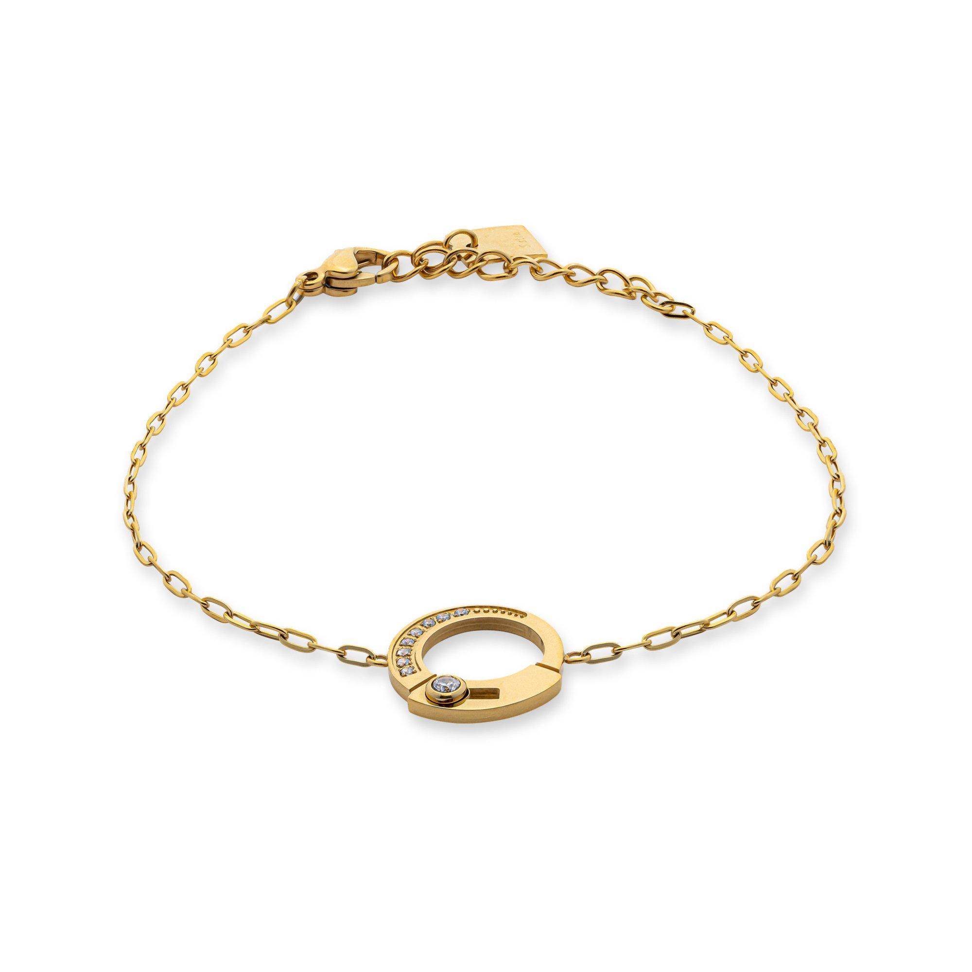 Diese Armkette von Zag Bijou aus poliertem Edelstahl ist aus einer groben Gliederkette hergestellt. Der moderne Anhänger in Kreisform ist mit Ziersteinen in verschiedenen Grössen besetzt. Das Kettchen schliesst per Karabinerverschluss und ist mit einem Label-Charm versehen.