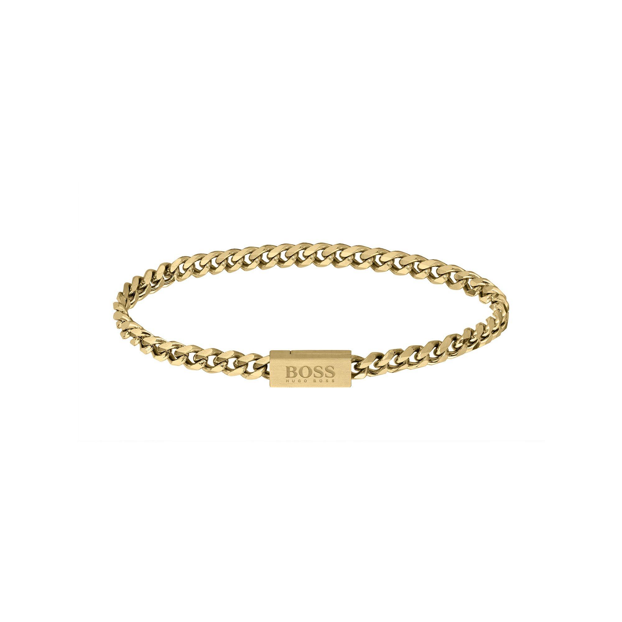 Das Hugo Boss Chain For Him Armband für Männer in goldfarbigem Edelstahl ist 19 cm lang und vereint markantes Design mit Eleganz.