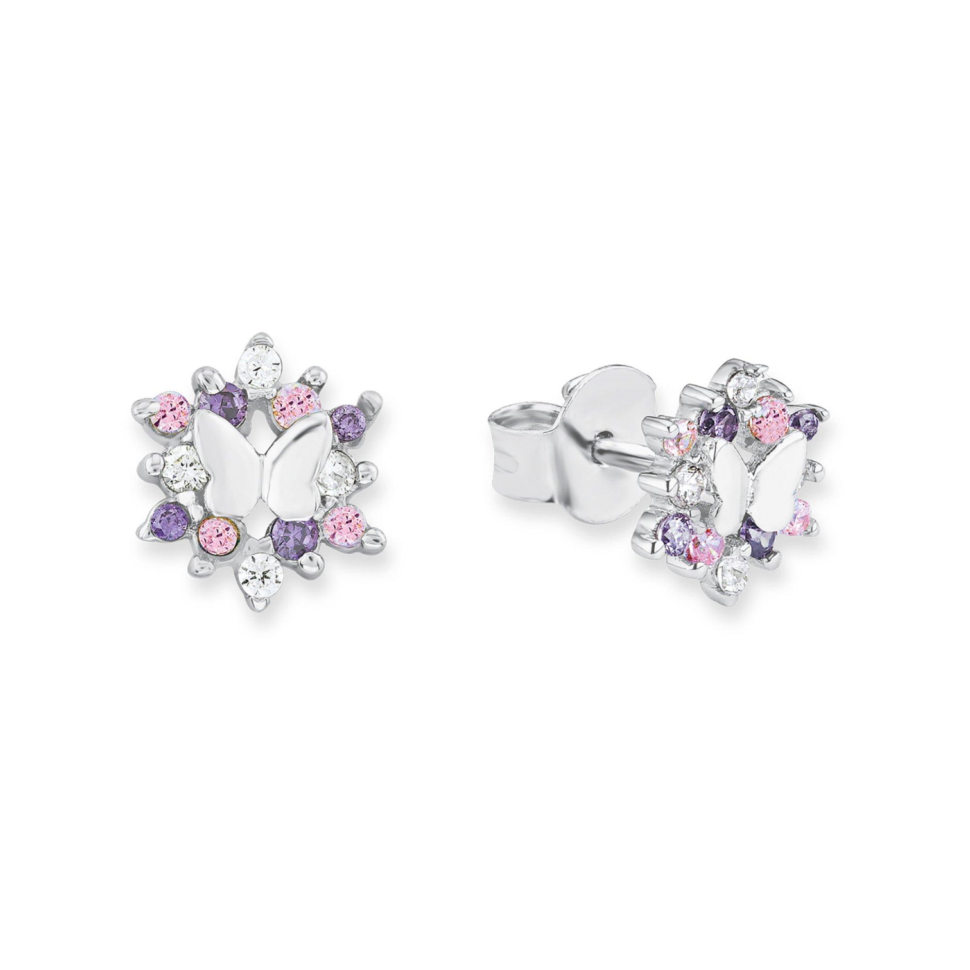 Einfach hinreissend sind diese niedlichen Ohrstecker für Mädchen mit ihren kleinen Schmetterlingen umgeben von glitzernden Zirkonia (synth.) in Weiss, Flieder und Rosa. Der süsse Ohrschmuck ist aus 925er Sterling Silber gefertigt und dank des praktischen Ohrsteckers besonders einfach zu handhaben.
