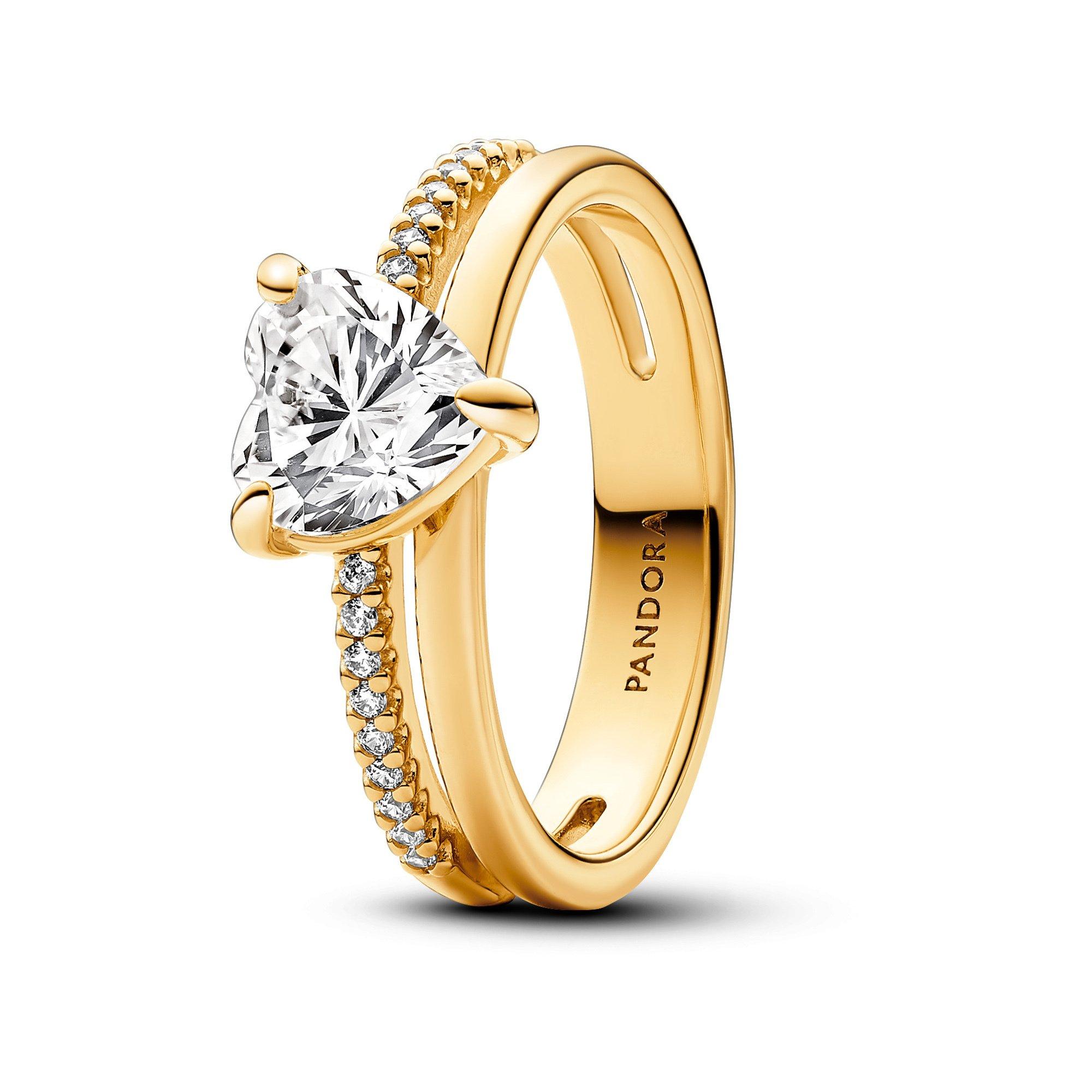 Liebe mutig mit dem Doppelband Herz Ring. Dieser vergoldete Ring hat ein einzigartiges Design mit zwei Bändern, die an mehreren Stellen verbunden sind: ein schlichtes poliertes Band und eins mit Pavé auf der vorderen Hälfte. In der Mitte befindet sich ein funkelnder, herzförmiger Cubic Zirkonia, der ein auffälliges Statement setzt. Ein modernes und dennoch klassisches Schmuckstück, das ein elegantes Geschenk für jemanden ist, der dein Herz besitzt.
