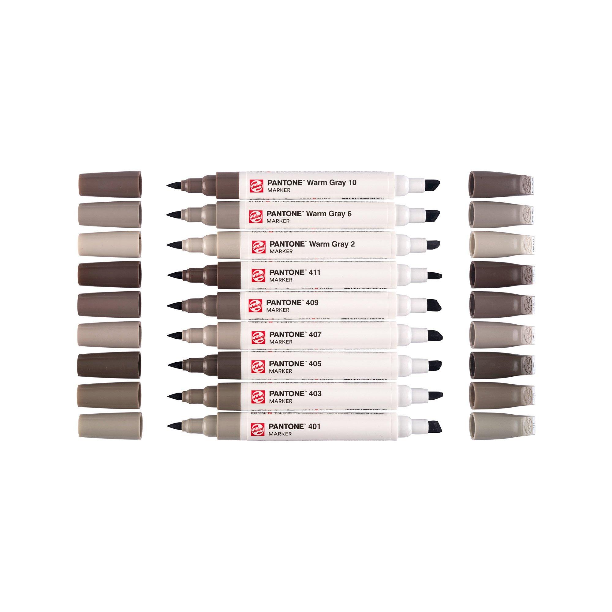 Mit Talens Pantone Markern in Pantone-Farben skizzieren, zeichnen und entwerfen! Diese hochwertigen Marker basieren auf dem Pantone Matching System und enthalten pigmentierte Tinte auf Wasserbasis in leuchtenden Farben. Sorgfältig formuliert, angepasst und getestet von Talens, mitgestaltet durch und freigegeben von Pantone. Dieses Set enthält 9 Talens Pantone Marker und wird in einem robusten Kasten mit einem eleganten, horizontalen Design geliefert, sodass Ihre Marker immer einsatzbereit sind und die Tinte optimal in beide Spitzen fliesst. Dank der Farbnamen und -nummern auf den Kappen der Marker haben Sie schnell die richtige Farbe für Ihre Arbeit zur Hand. Setzen Sie Ihre Ideen um und entdecken Sie die Möglichkeiten! Jeder Marker hat zwei Spitzen und bietet somit die ultimative Flexibilität: eine Pinselspitze für Details und präzise Linien, und eine Keilspitze für breite Striche und dicke Farbblöcke. Die Tinte trocknet schnell und ist nach dem Trocknen wasserfest, sodass sie sich perfekt zum Auftragen in Schichten eignet. Verwenden Sie die Marker auf dem einzigartigen Talens Pantone Papier für die optimale Übereinstimmung mit den Pantone-Farben. Wenn Ihrem Marker die Tinte ausgeht, füllen Sie ihn einfach mit der Marker-Tinte von Talens Pantone in derselben Farbe nach! Beide sind in einer umfangreichen Palette von 108 Farben erhältlich, sodass Sie Ihrer Kreativität freien Lauf lassen können.