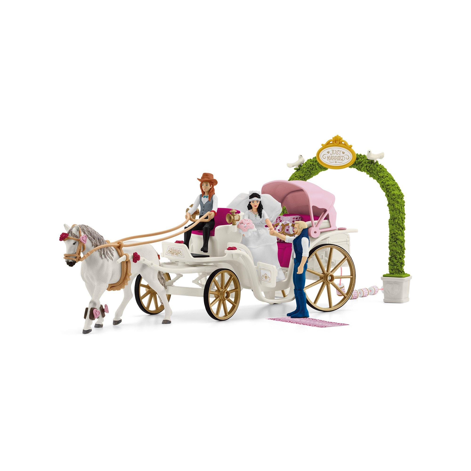 Emily sieht in ihrem Hochzeitskleid bezaubernd aus. Auch Bräutigam Toby hat sich in Schale geworfen. Gemeinsam besteigen sie die Hochzeitskutsche, an der scheppernde Dosen befestigt sind. Hanna hat den Lipizzaner und die Kutsche festlich geschmückt. Das Pferd trägt Gamaschen mit Herzchen und auch das Zaumzeug ist mit Herzen verziert. Auf dem roten Polster der Kutsche macht es sich das Brautpaar auf Herzkissen bequem und stösst mit Sekt an. Was ist denn das? Unter der Sitzbank ist ja ein Geheimversteck! Darin warten Äpfel auf den Lipizzaner, der das Brautpaar durch den Torbogen fährt.