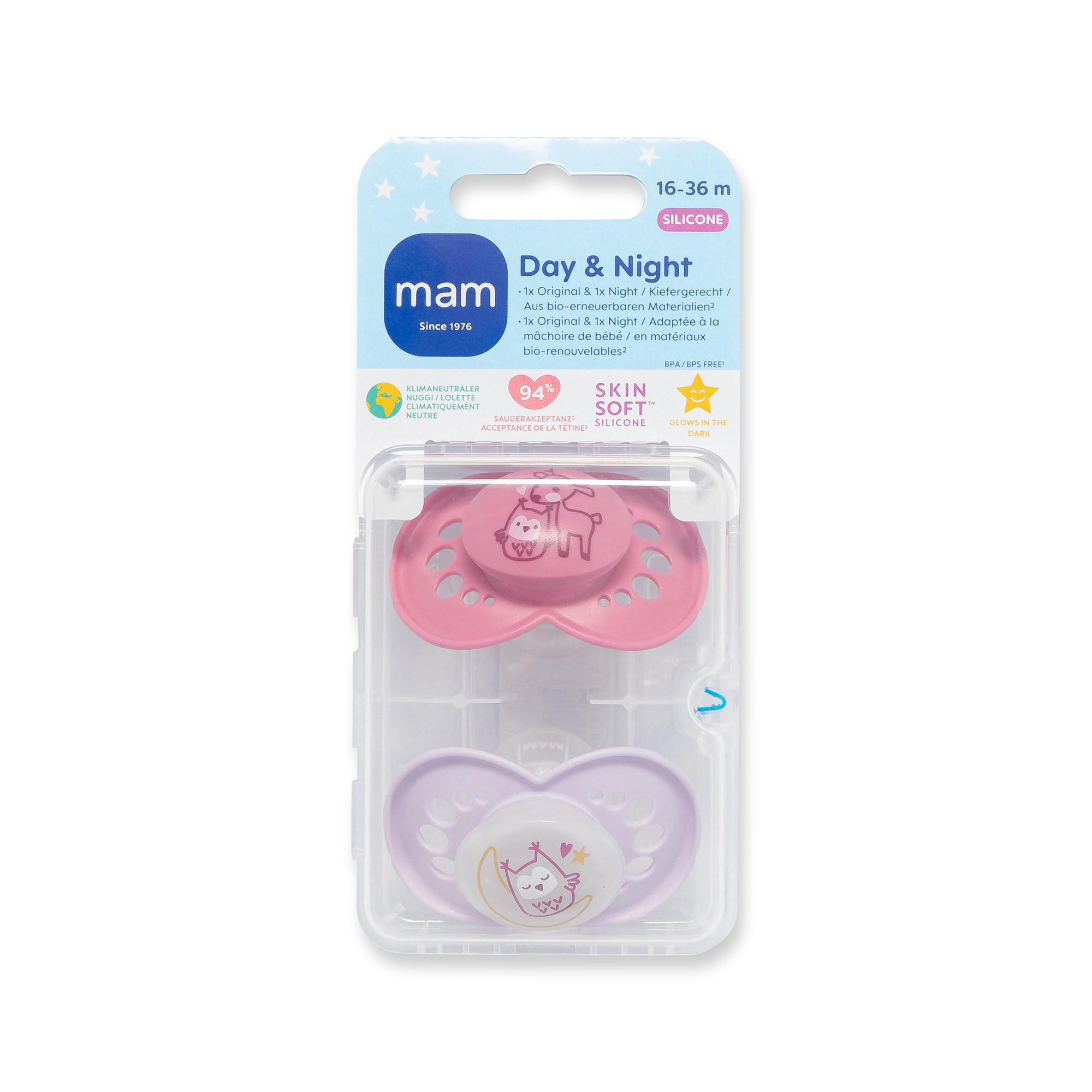 Nuggis Mam Day & Night im Duopack mit Tiermotiven und mit Sterilisierbox, für Babys und Kleinkinder im Alter von 16 bis 36 Monaten. Im Lieferumfang sind ein Mam-Original- und ein Mam-Night-Nuggi enthalten. Der Night-Nuggi leuchtet im Dunkeln. Das Produkt wird in einer Sterilisier- und Transportbox geliefert – zum bequemen und zeitsparenden Sterilisieren in der Mikrowelle. Mam-Nuggis wurden mit medizinischen Experten entwickelt und verfügen über einen symmetrischen, schmalen und kiefergerechten Sauger. Mam bestätigt eine 94-prozentige Saugerakzeptanz. Mam-Artikel sind mit Mam Skin Soft™ Silicone und aus BPA- und BPS-freien sowie bio-erneuerbaren Materialien hergestellt. Mam-Nuggis werden in Europa produziert.