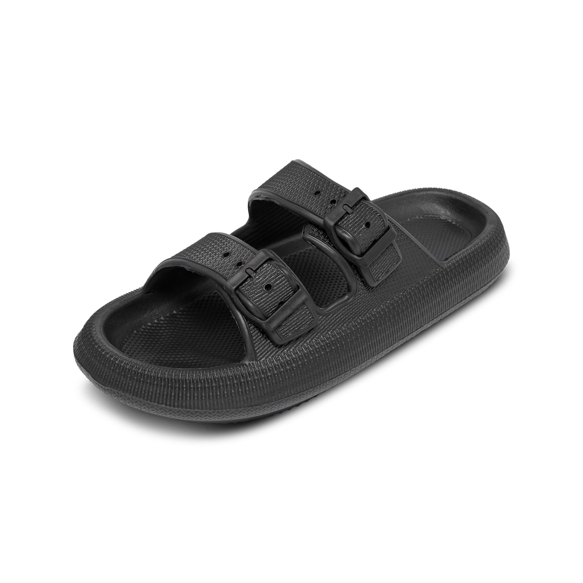 Diese bequemen Hausschuhe verfügen über ein Zwei-Riemen-Design mit verstellbaren Schnallen, die einen sicheren und anpassbaren Sitz bieten. Das konturierte Fussbett bietet Halt und macht sie ideal für den Innenbereich oder den gelegentlichen Gebrauch im Freien.