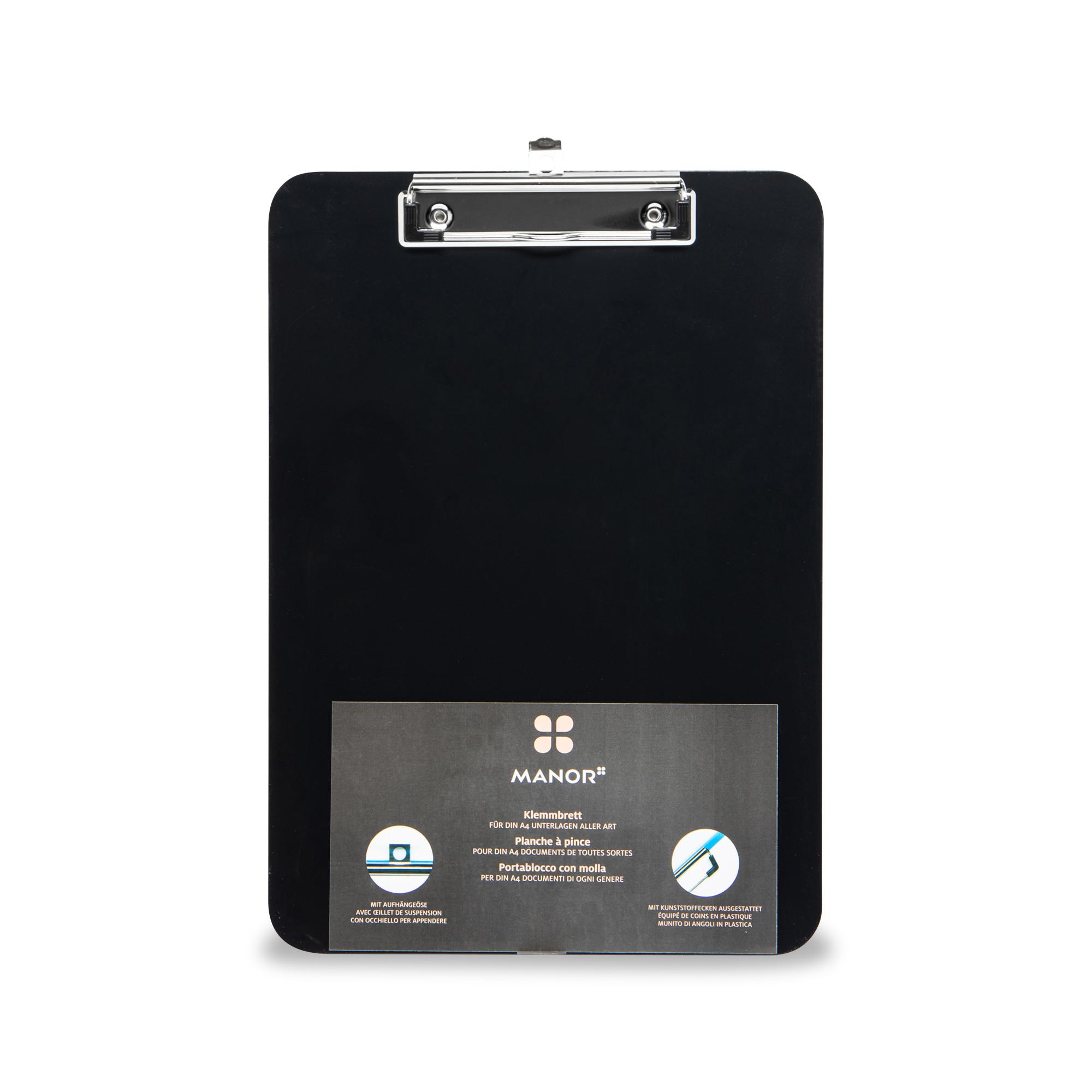 Dieses Klemmbrett von Manor ist für Unterlagen bis DIN A4 konzipiert. Es hat eine Aufhängeöse und Kunststoffecken.
