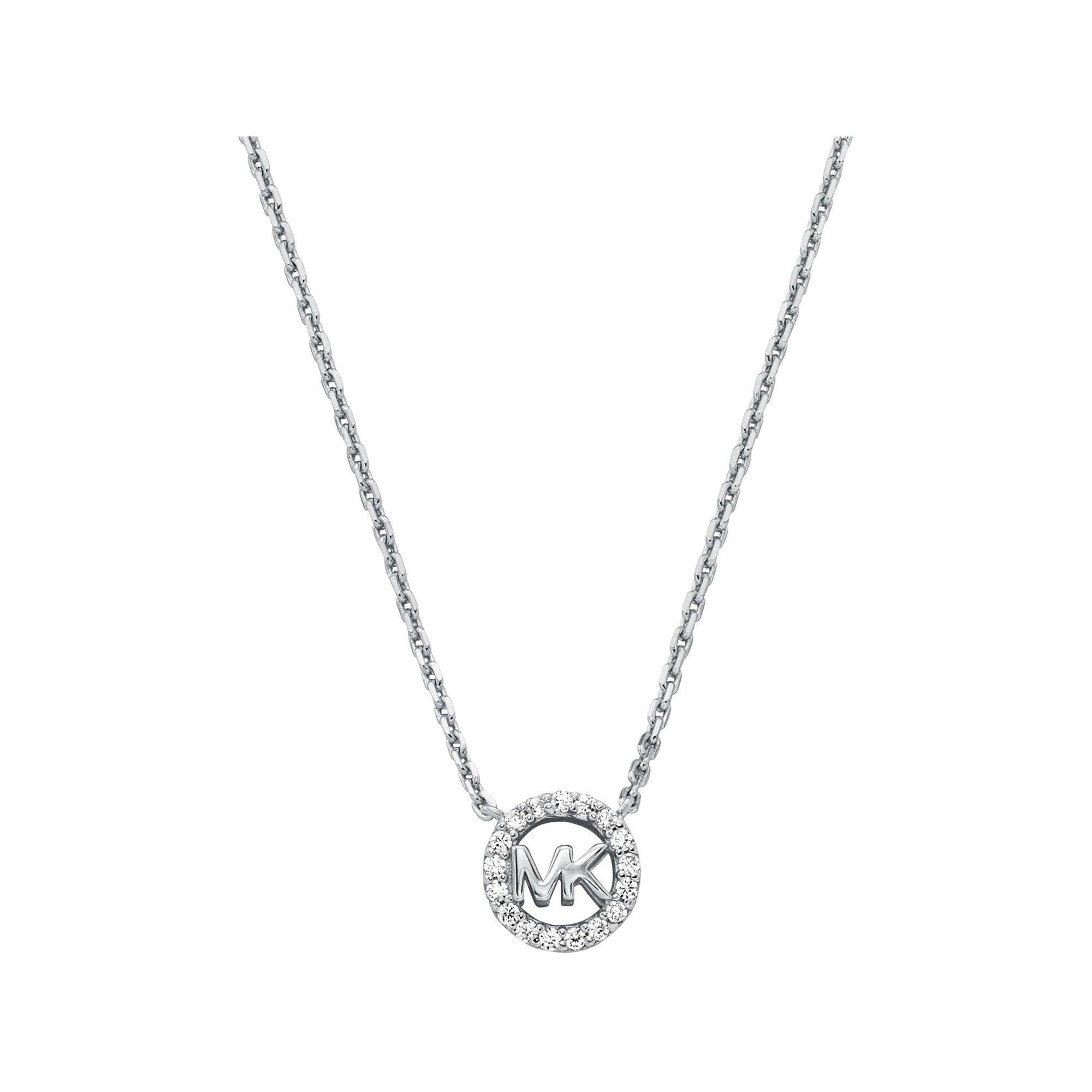 Dieses edle Collier von Michael Kors ist aus Sterling-Silber hergestellt. Der Anhänger zeigt die Label-Initialen, umrahmt von einem mit facettierten Zirkonia-Steinen besetzten Ring. Die Kette lässt sich in der Länge anpassen und schliesst mit einem Federring-Verschluss.
