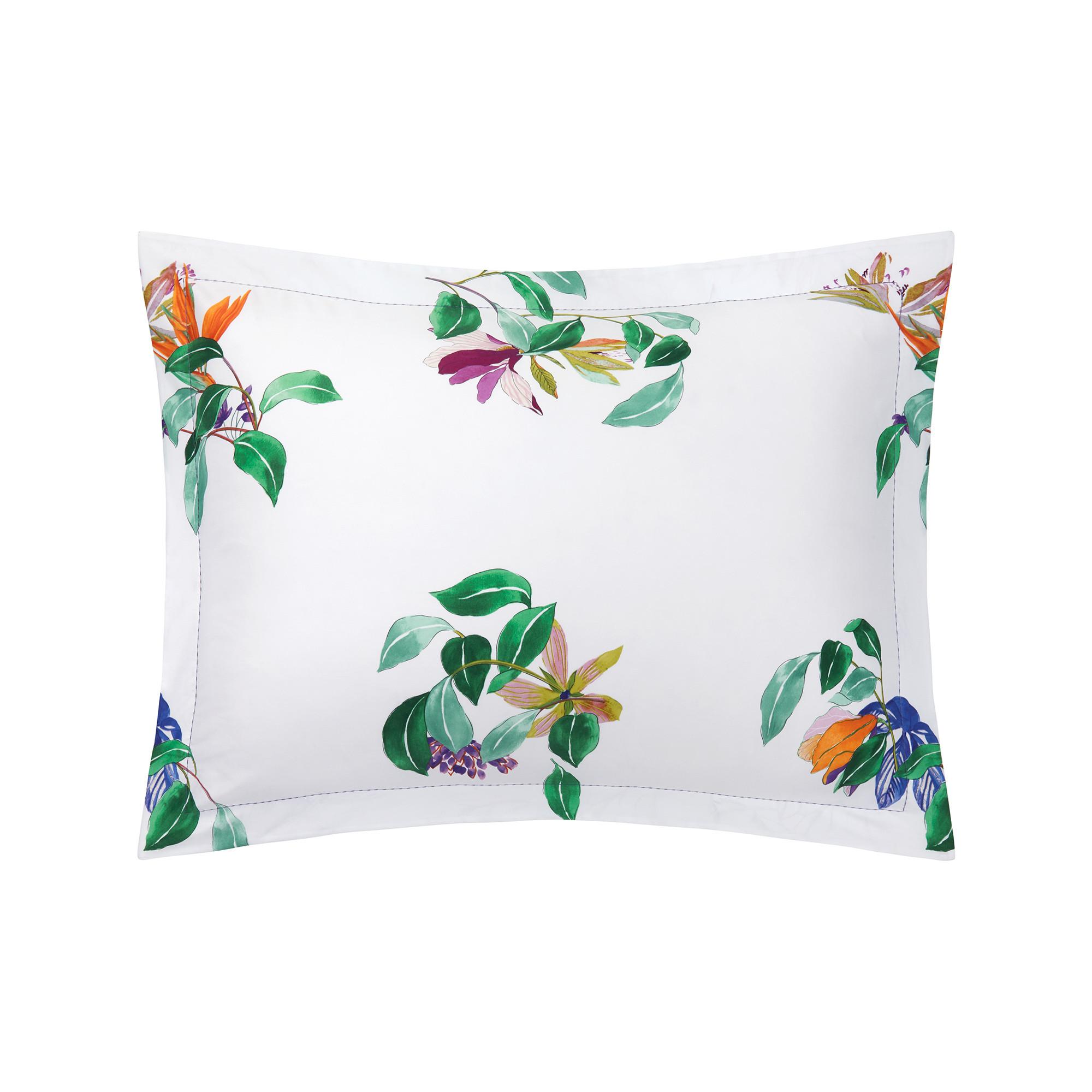 Dieser Kissenbezug zeigt ein lebhaftes Blumenmuster, das jedem Schlafzimmerdekor einen Hauch von naturnaher Schönheit verleiht. Das Design präsentiert farbenfrohe Blüten und üppige grüne Blätter, die eine frische und einladende Ästhetik schaffen. Er ist aus Bio-Baumwollsatin gefertigt.