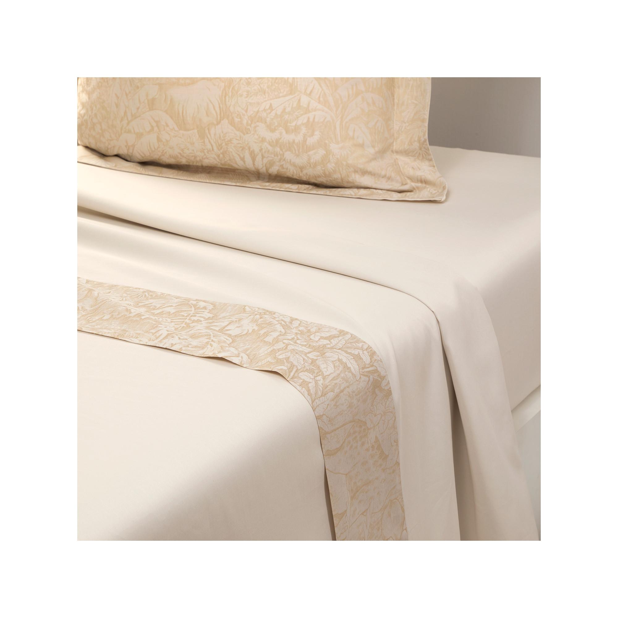 Der Faune-Jacquard ist ein üppiger Dschungel in goldenen Sandtönen, der sich in einem Geflecht aus Licht und Schatten zeigt. Getarnte Tiere, Palmen und seltene Blumen für ein Stück dekorativen Luxus.
