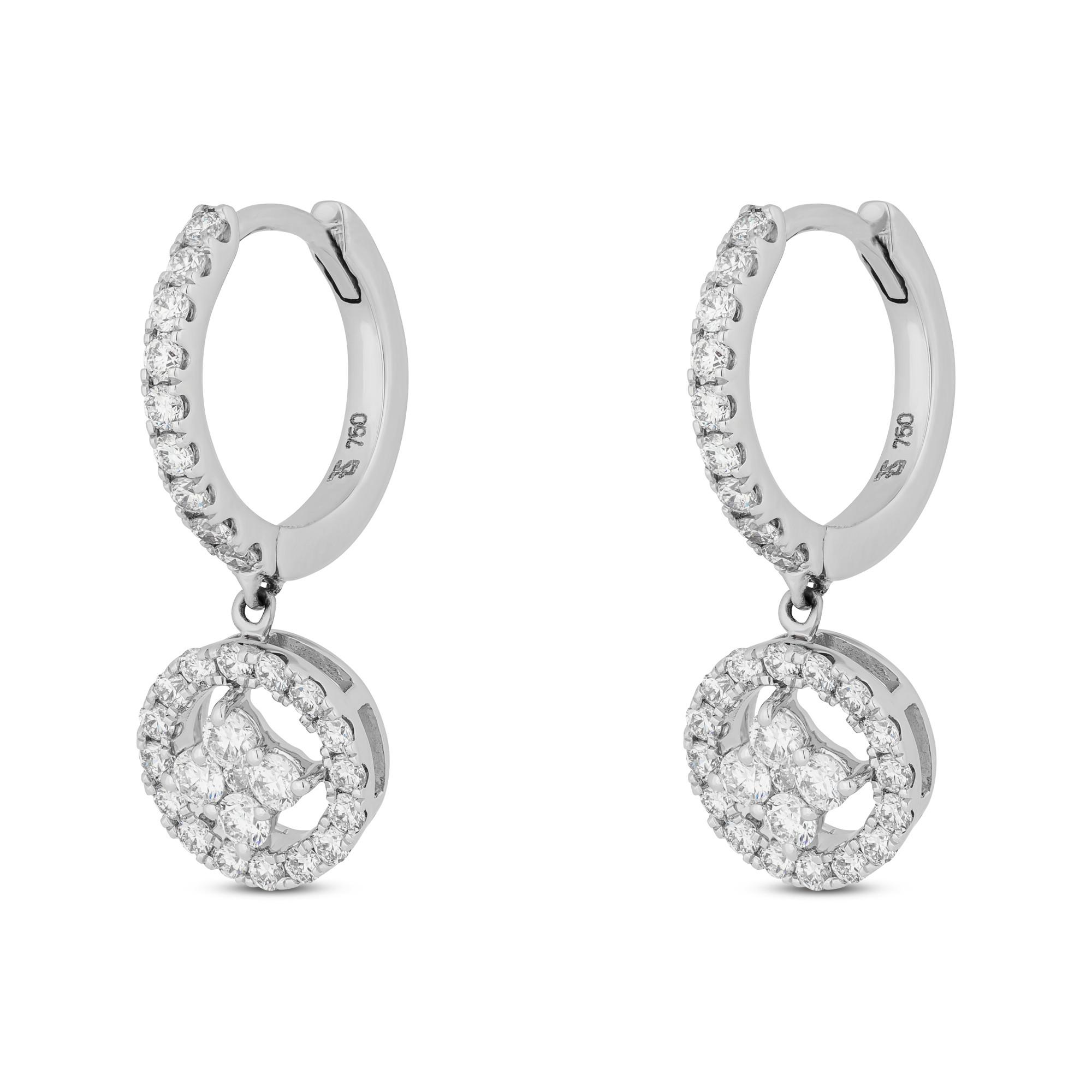 Die filigranen Ohrhänger von Sergio Ferris aus 18-karätigem Weissgold sind mit insgesamt 60 brillant geschliffenen Diamanten besetzt. Sie sind als anliegende Creolen konzipiert mit Steckverschlüssen, an denen die frei beweglichen runden Anhänger mit stilisierter Blumenform im Zentrum das Licht der Sonne einfangen.