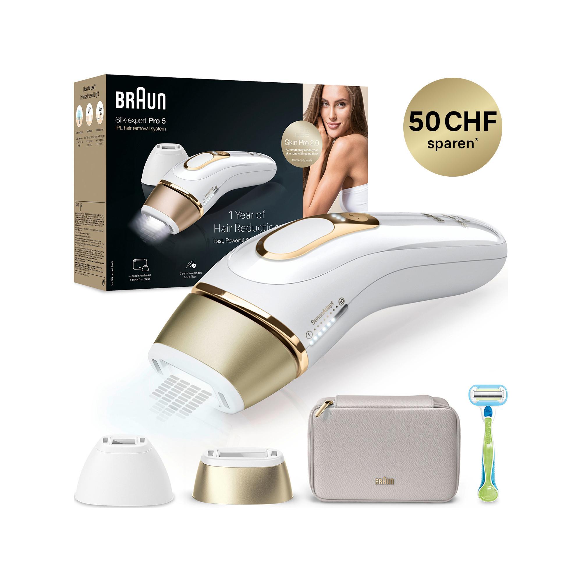 Silk·expert Pro 5 ist ein schnelles und effektives IPL-Haarentfernungsgerät von Braun. Unser IPL ist kein Laser-Haarentfernungsgerät, stattdessen nutzt es die fortschrittliche IPL-Technologie, um dir 1 Jahr lang seidig-glatte Haut zu schenken, mit sichtbaren Ergebnissen in nur 3 Wochen (Unter Einhaltung des Behandlungsplans. Ergebnisse können variieren). Der Skin Pro 2.0 Sensor (SensoAdaptTM) passt sich automatisch an deinen Hautton an und optimiert die Lichtintensität für eine perfekte Balance zwischen schnellen Ergebnissen und idealer Hautverträglichkeit. 2 Intensitätsstufen bieten optimalen Hautkomfort. Bis zu 125 Lichtimpulse pro Minute sorgen für weniger ausgelassene Bereiche beim Gleiten über deine Haut.