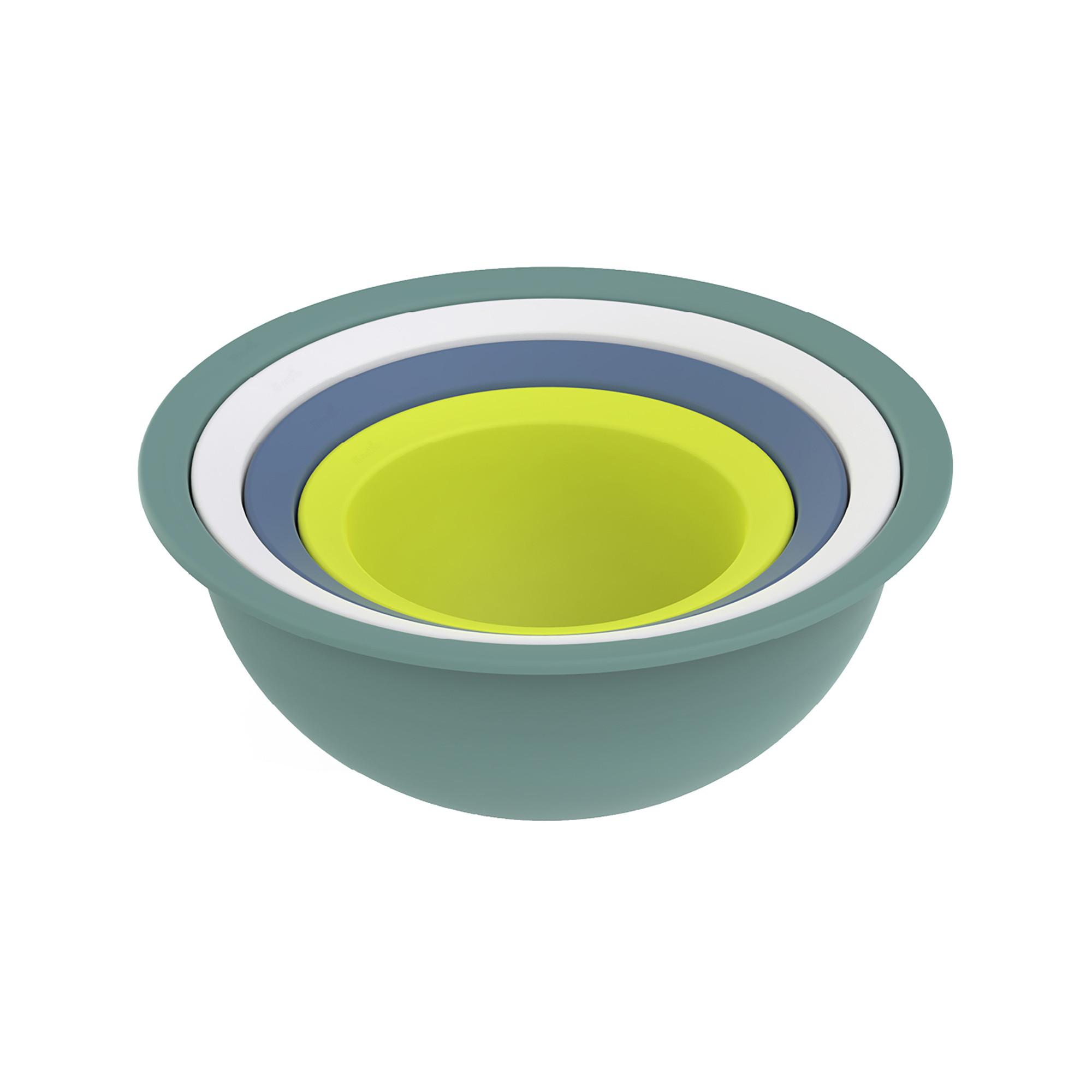 In diesem farbenfrohen Set finden Sie platzsparend verstaut alles, was Sie an Schüsseln und Sieb für den täglichen Gebrauch benötigen. Durch die gerundete Form ist die Schüssel auch zum Kneten von Teig ideal. Zusammen mit dem Sieb erlaubt sie ein direktes Servieren von Salat und Pasta von der Küche auf den gedeckten Tisch. Die Schüsseln haben ein Volumen von 1, 2 und 4,8 Litern, das Sieb hat ein Volumen von 3,2 Litern.