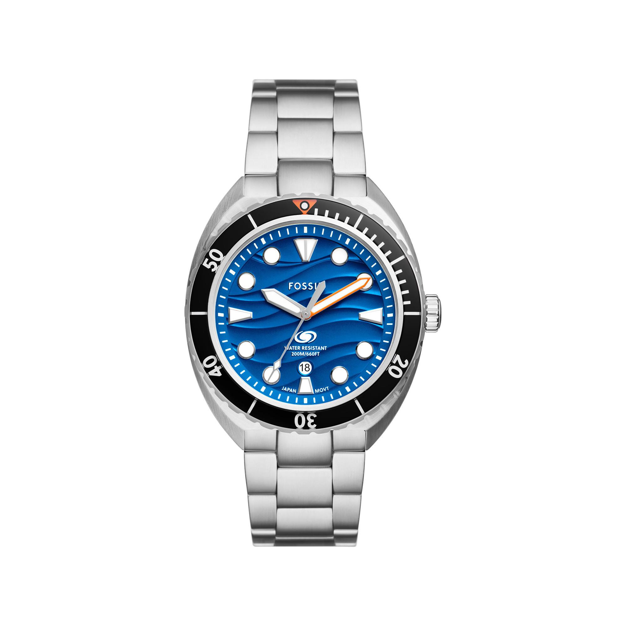 Fossil präsentiert ihre leistungsstärkste Uhr im Tauchsportstil mit dunkelblauem, strukturiertem Zifferblatt. Sie ist bis zu 20 ATM wasserdicht und hat eine moderne Ästhetik, die für Abenteuer auf offenem Wasser gemacht ist.