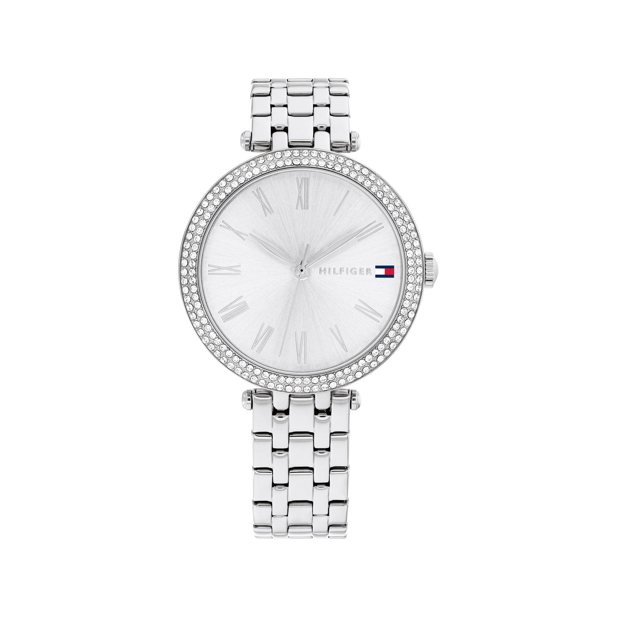 Die Tommy Hilfiger Damenuhr "NATALIE" ist ein stilvolles Accessoire für jede Gelegenheit, mit funkelnd verziertem Edelstahlgehäuse und Edelstahlarmband. Dank kratzfestem Mineralglas und einem präzisen Quarzuhrwerk ist sie zuverlässig und bis zu 30 Metern wasserdicht.
