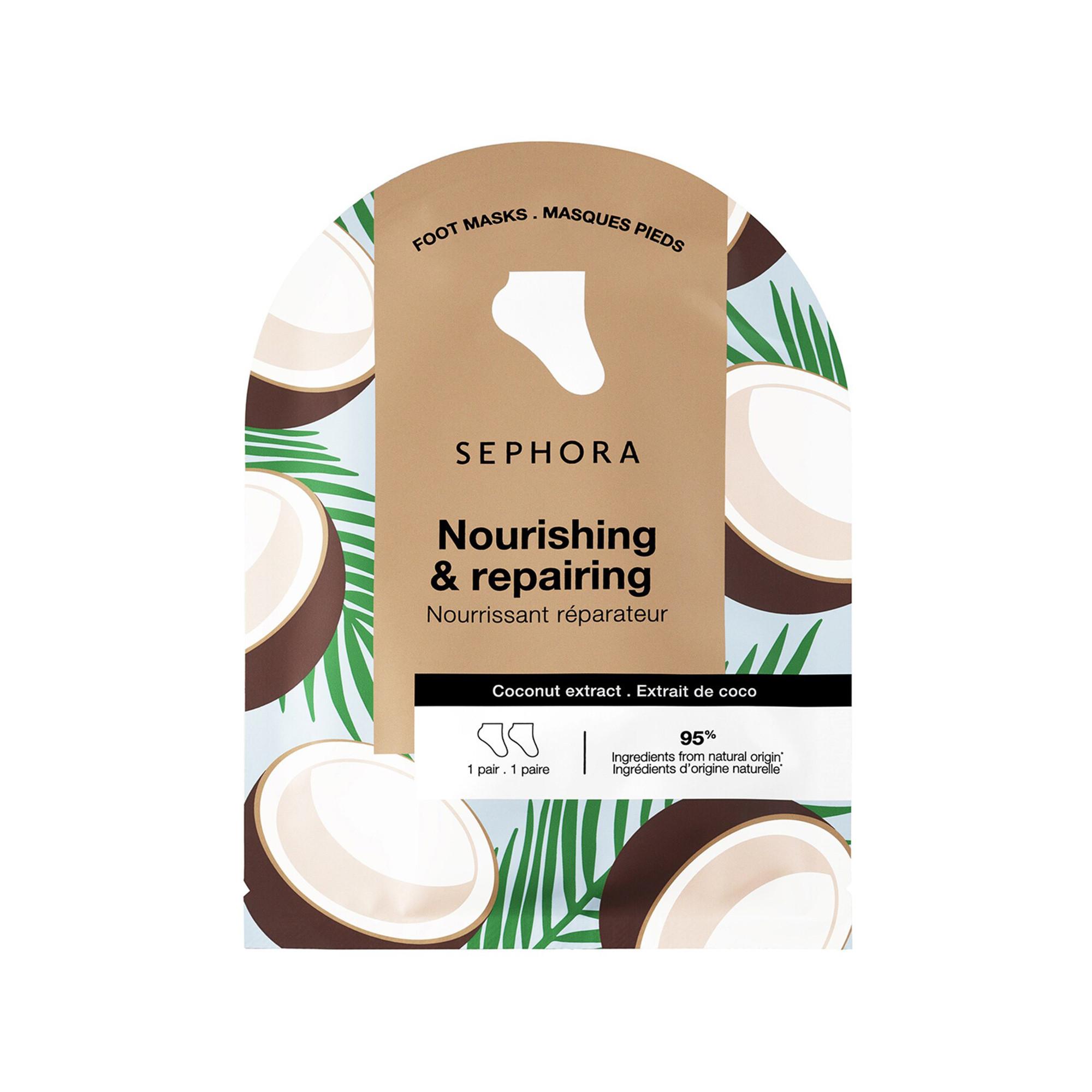 Reparierende, nährende Fussmaske mit Kokosnussextrakt. Die Fussmaske mit Kokosnussextrakt pflegt und bietet eine reparierende Wirkung für alle Hauttypen, einschliesslich trockener Haut; sie ist ideal für trockene Fersen, um sie wieder weich und geschmeidig zu machen. Angereichert mit Kokosnussextrakt. Die Formel, die du liebst, in einem neuen Design.