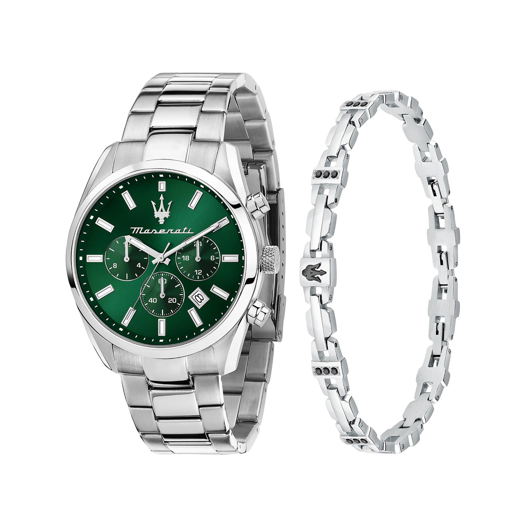 Das Maserati Attrazione Herrenuhr-Set, Teil der Attrazione Kollektion, besticht durch technische Präzision und eleganten Stil. Die Uhr verfügt über ein teilpoliertes Edelstahlgehäuse in Silber, ein blaues Zifferblatt mit Sonnenschliff und vergoldeten Indizes sowie ein passendes Edelstahl-Gliederarmband. Ergänzt wird das Set durch ein silbernes Maserati Armband aus Edelstahl mit dem charakteristischen Dreizack.