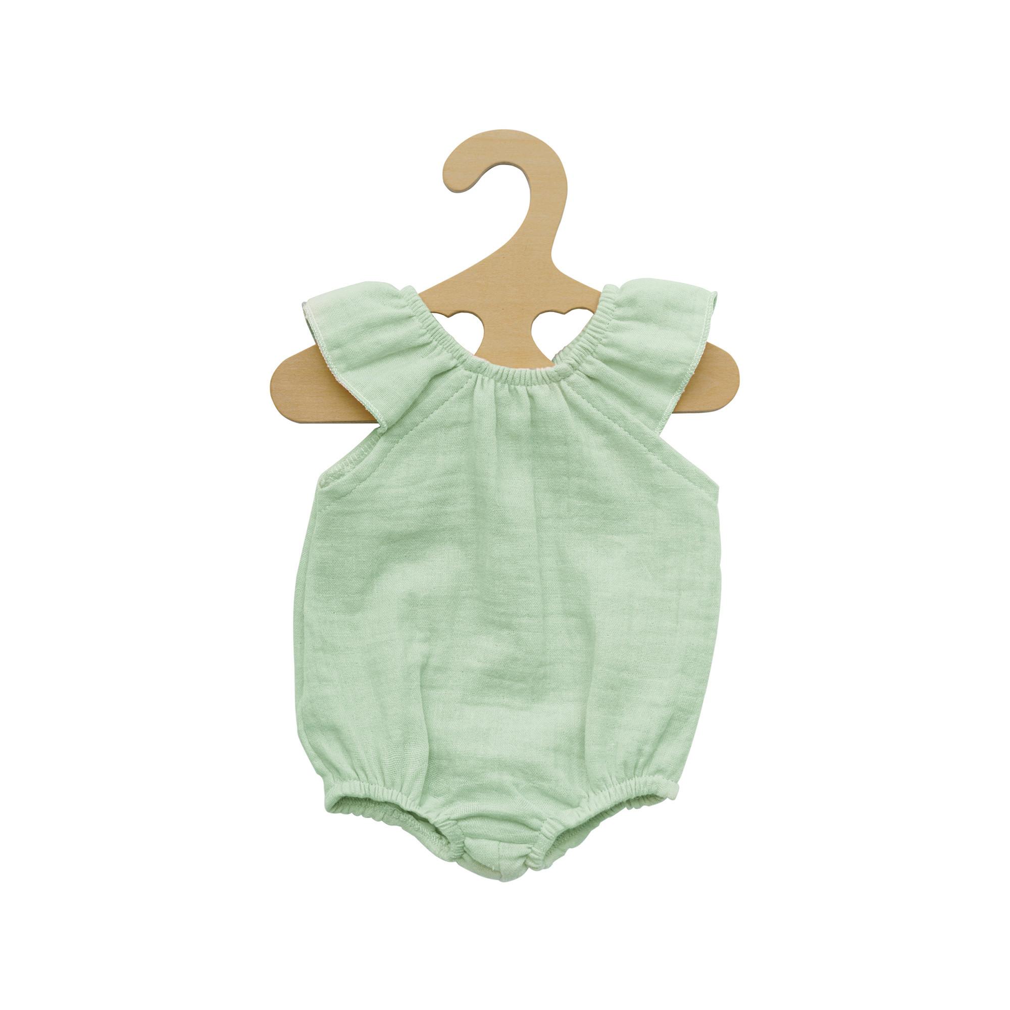 Der niedliche Puppenbody von Heless aus 100 % Bio-Baumwolle in pastelligem Mint überzeugt mit verspielten Rüschen und vielseitiger Tragbarkeit. Der weiche Musselinstoff und der Klettverschluss machen das An- und Ausziehen für Puppen der Grösse 28–35 cm besonders einfach.