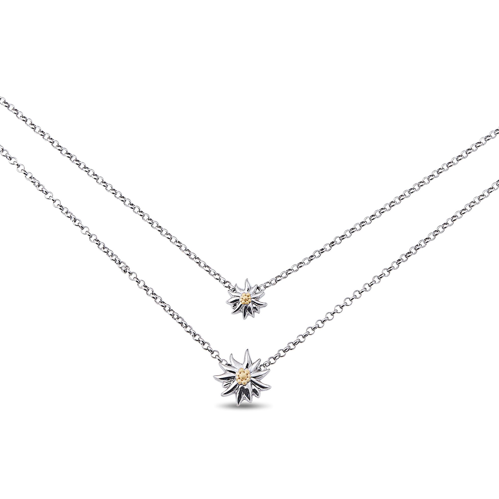 Doppelte Halskette aus Sterlingsilber mit zwei glänzenden Edelweiss-Anhängern in Bicolor. Die Marke "Edelweiss" ist ein Symbol der Schweiz und der Alpen, weltweit bekannt für ihre vermeintlich magischen Kräfte.