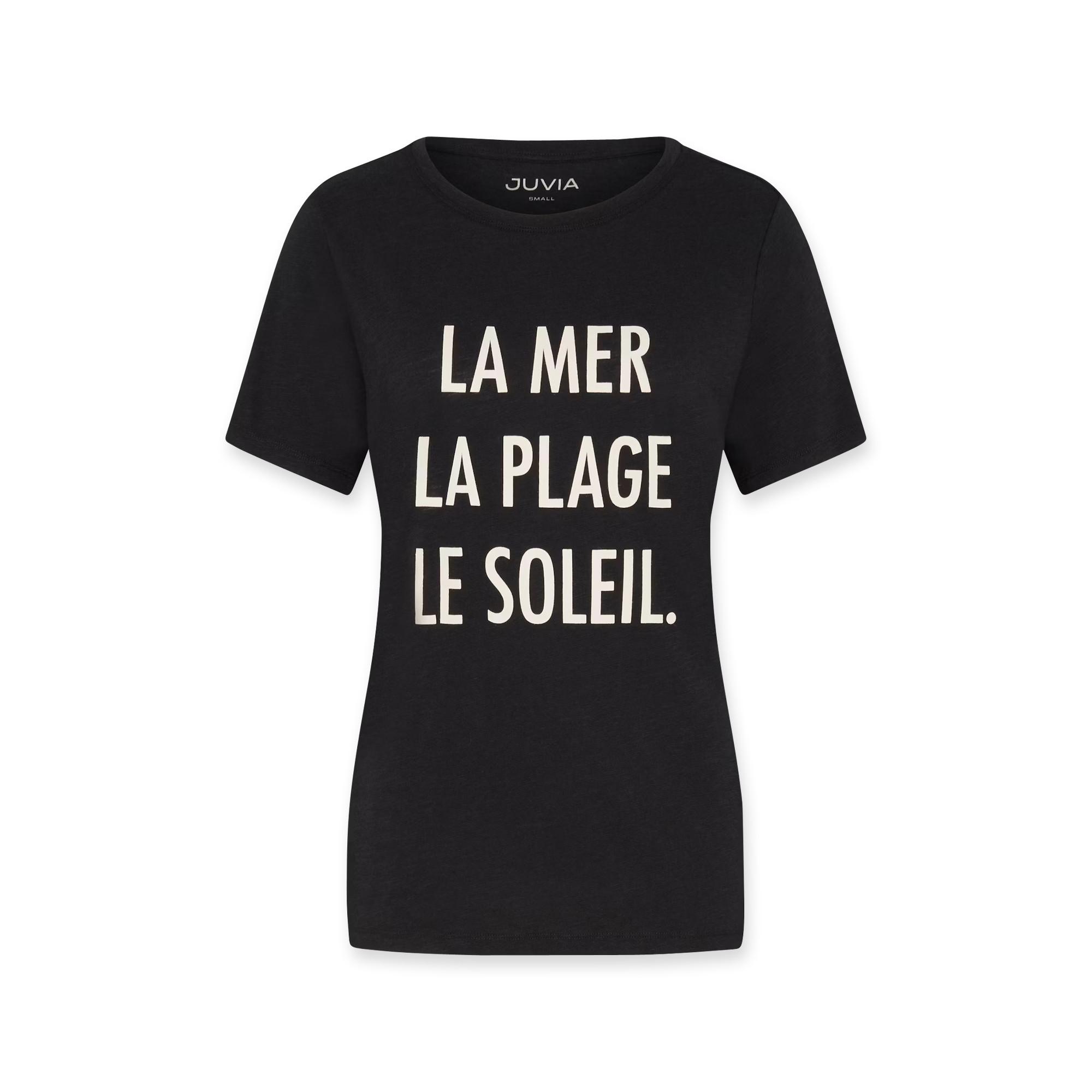 Dieses Juvia T-Shirt überzeugt durch seine feinstrukturierte Qualität und den femininen Rundhalsausschnitt. Der „La Mer“ Designprint und die klassisch kurzen Ärmel verleihen ihm eine besondere Note. Der doppelt vernähte Saumabschluss sorgt für eine langlebige Passform.