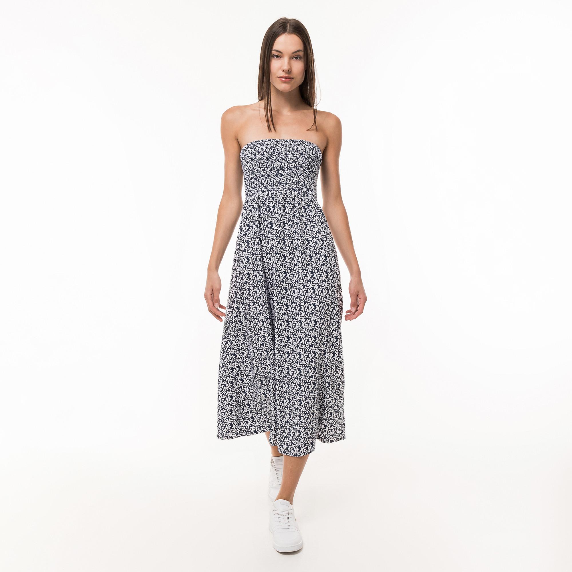 Dieses schulterfreie Midikleid mit floralem Design und gesmoktem Bandeau-Top ist ein unkompliziertes, feminines Basic, das sich vielseitig kombinieren lässt – selbst als Maxirock.